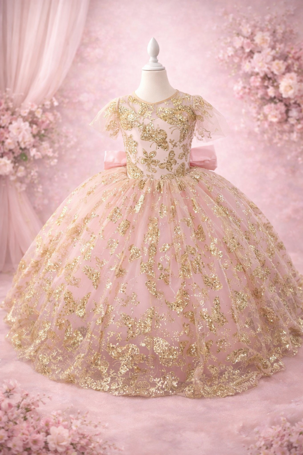 This enchanting 2-in-1 dress is perfect for a special occasion. The dress features a delicate sheer neckline and short sleeves. Shimmering butterfly and sequin accents adorn the garment, with the lace available in your choice of baby blue, gold, rosegold, or lilac. The full-length, voluminous A-line skirt creates a captivating first look, and can be removed to reveal a charming shorter dress underneath, offering versatility and comfort for dancing and play. A large, elegant bow on the back completes the look with a touch of whimsy.