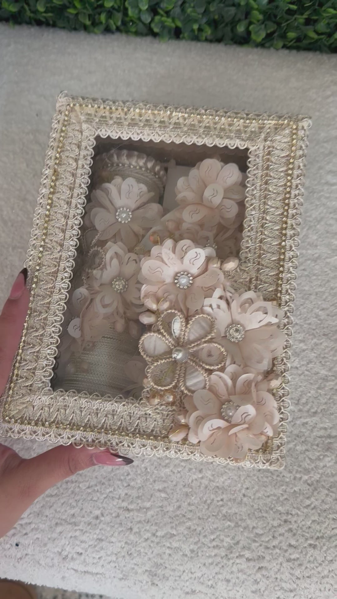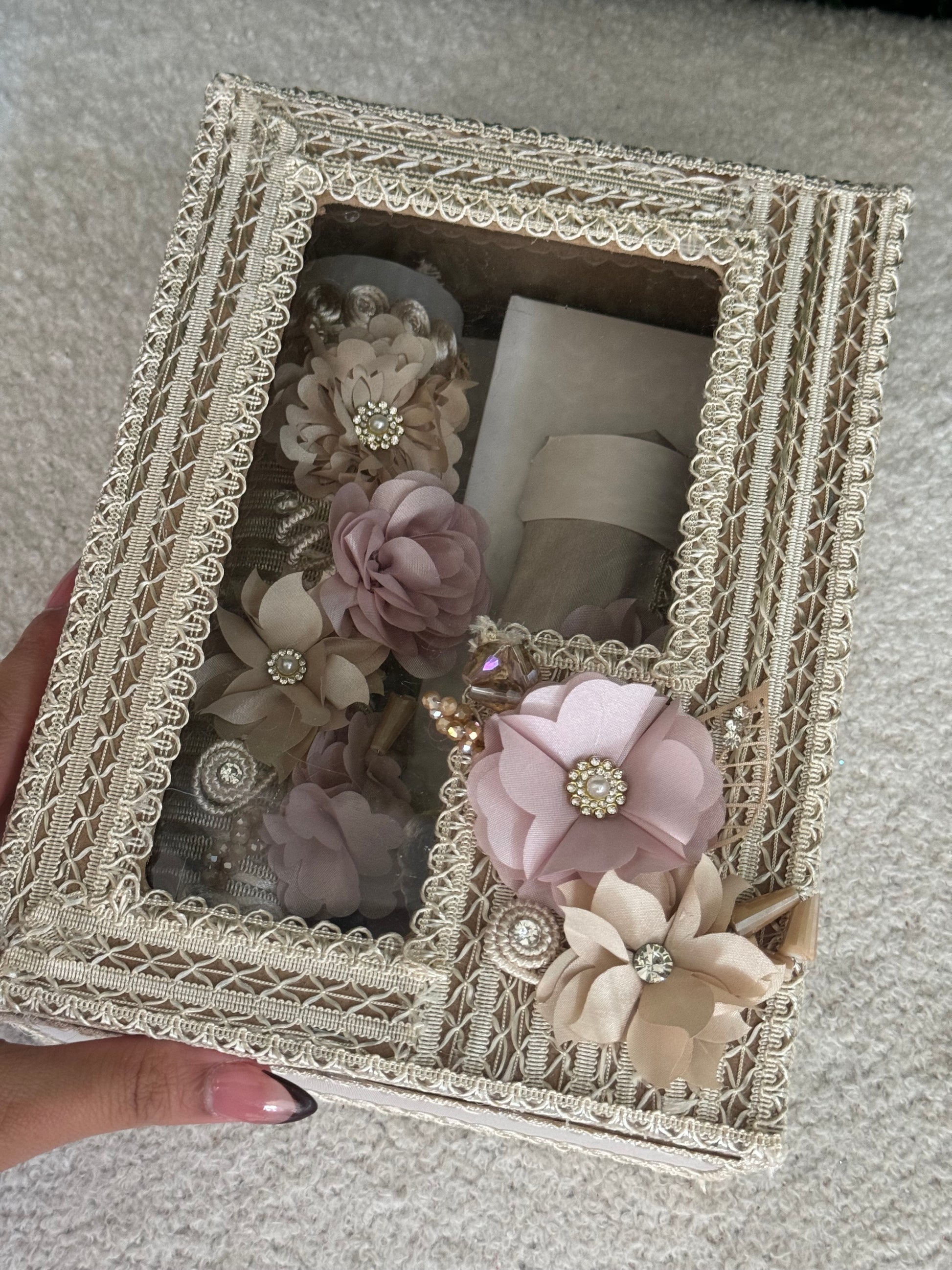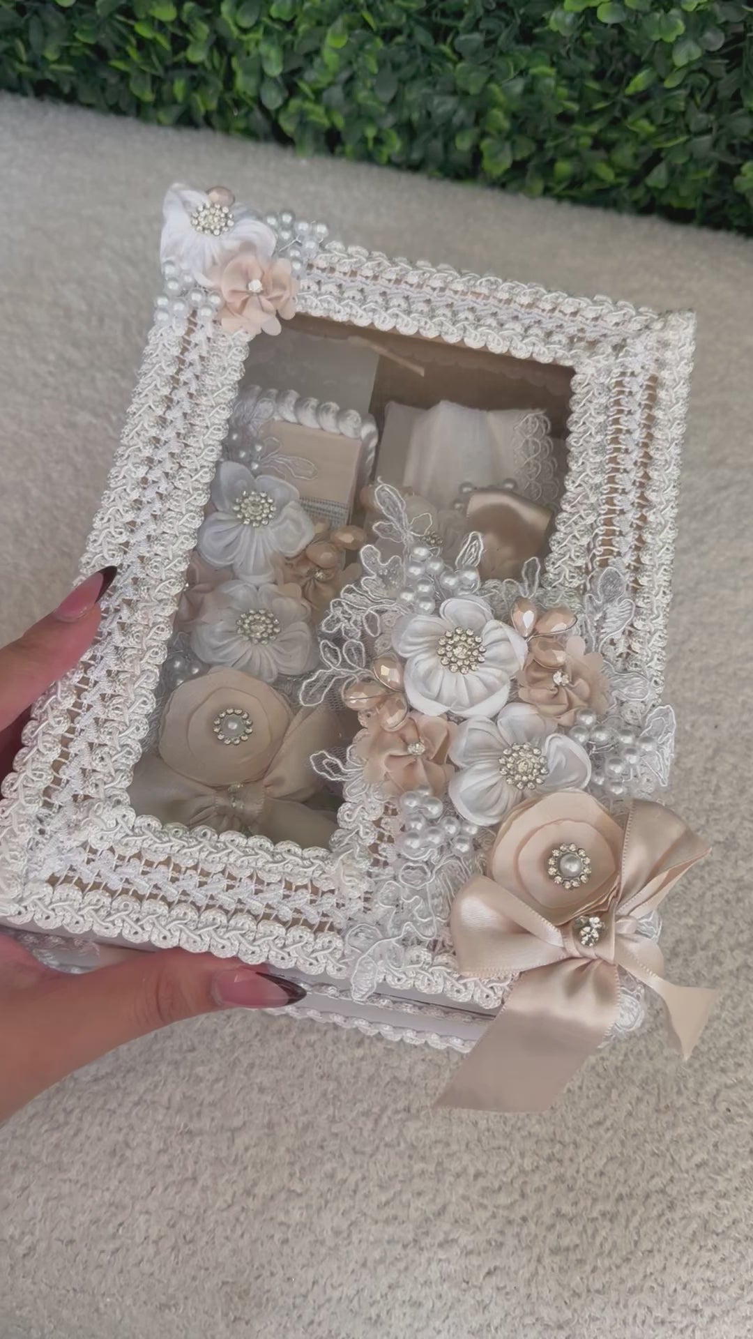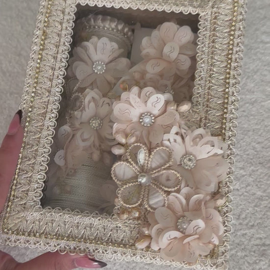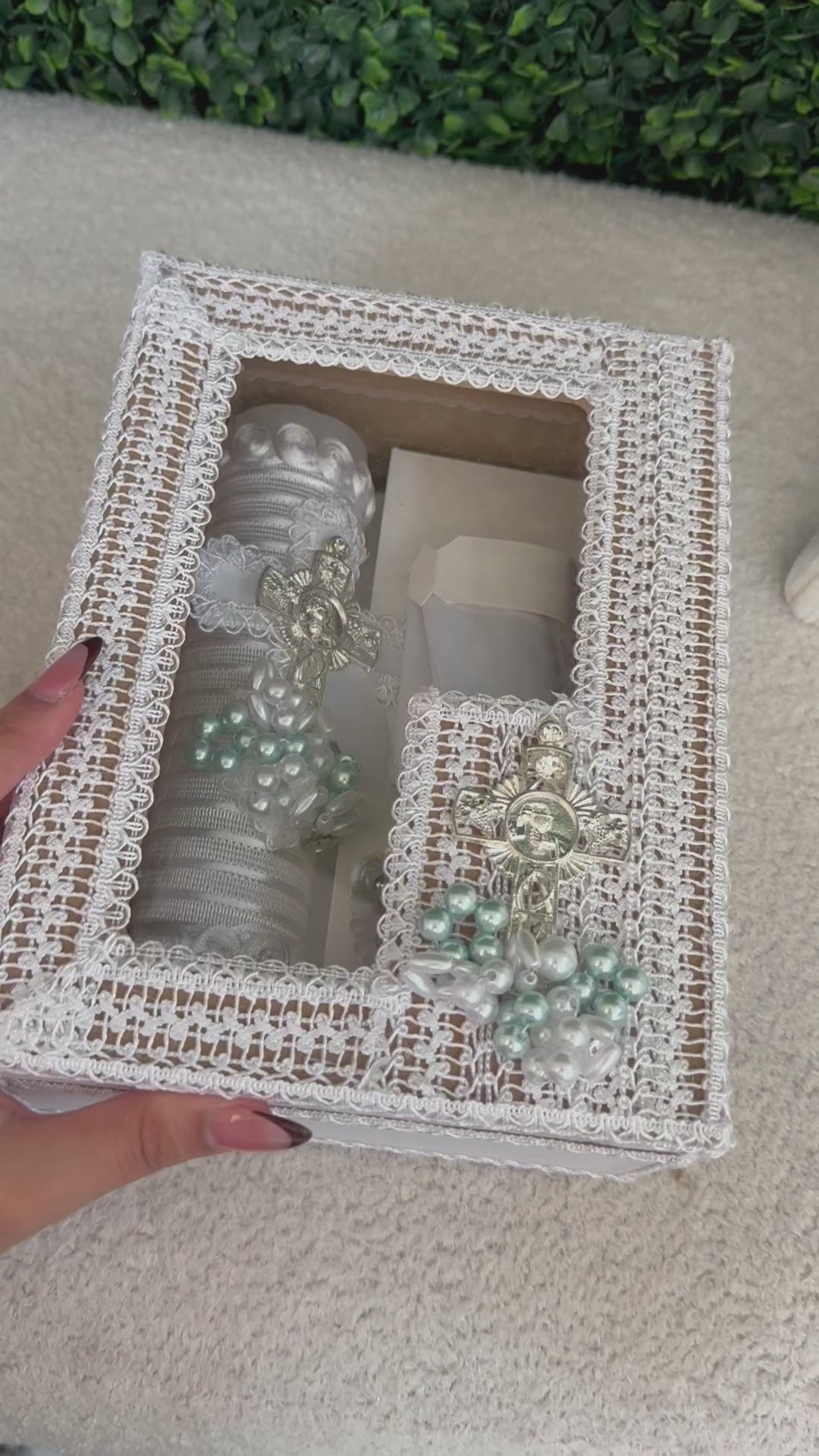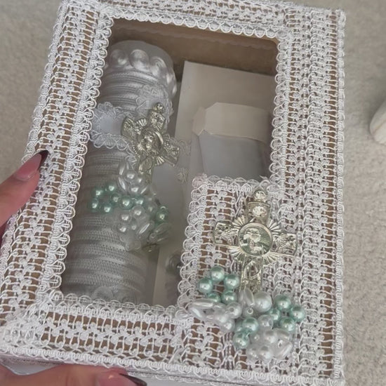 Baptism Gift Box including towel, shell, and candle, presented in an elegant decorative box.