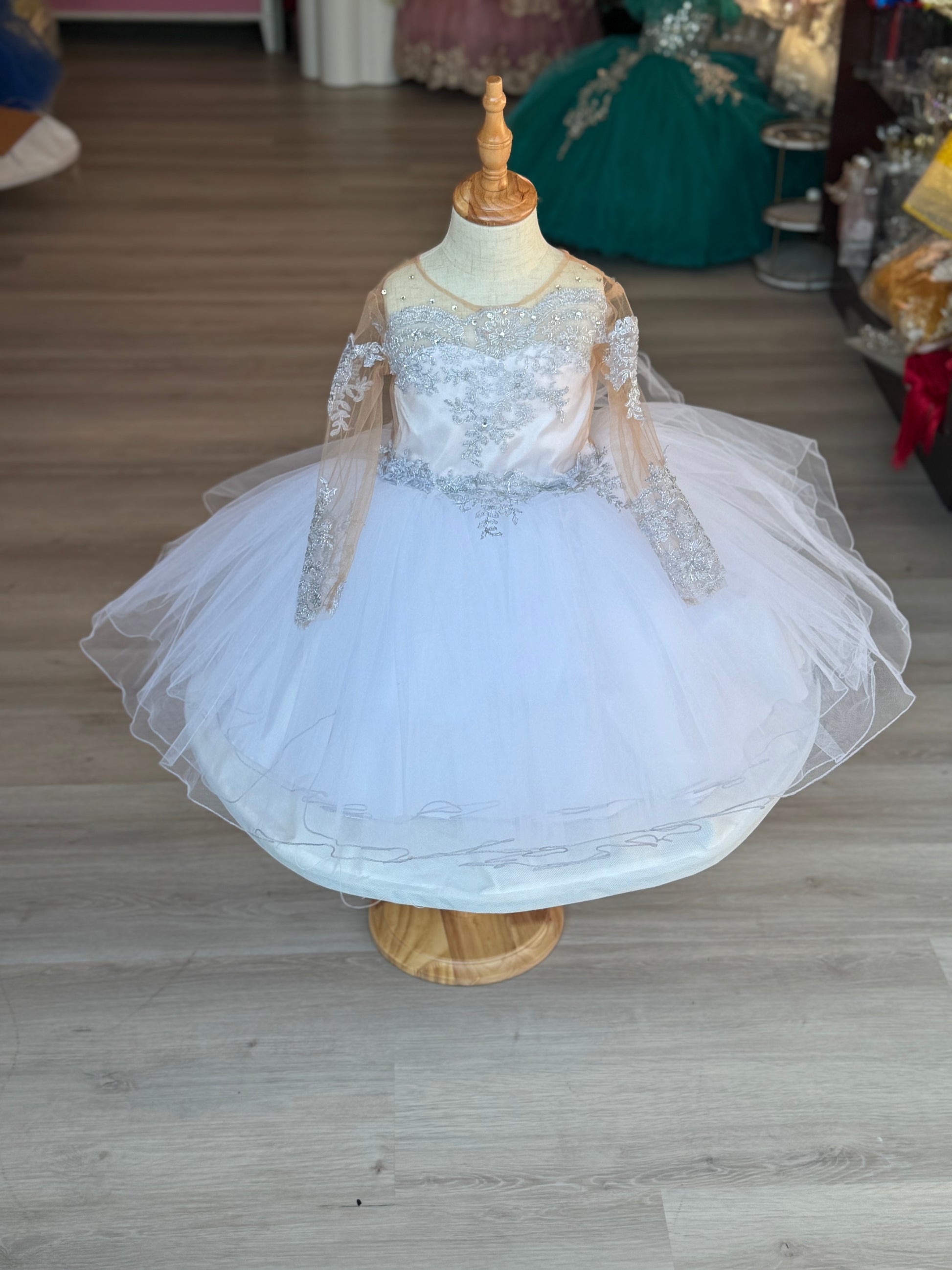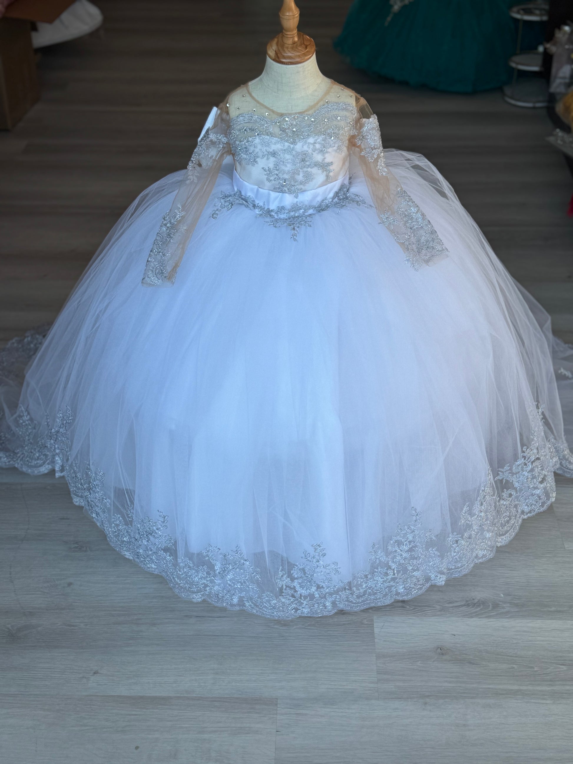 "This beautiful 2 in 1 ball gown features a full, layered skirt with a dramatic train, perfect for a grand entrance. The entire skirt and train are bordered with an elegant lace appliqué. The bodice is also detailed with matching lace over a sheer fabric, complementing the long, delicate sleeves. The back of the gown features a sophisticated bridal button-up design, adding a touch of classic elegance. A large, satin bow at the back completes the enchanting princess look, making this dress ideal for quinceañeras, formal events, and special celebrations.