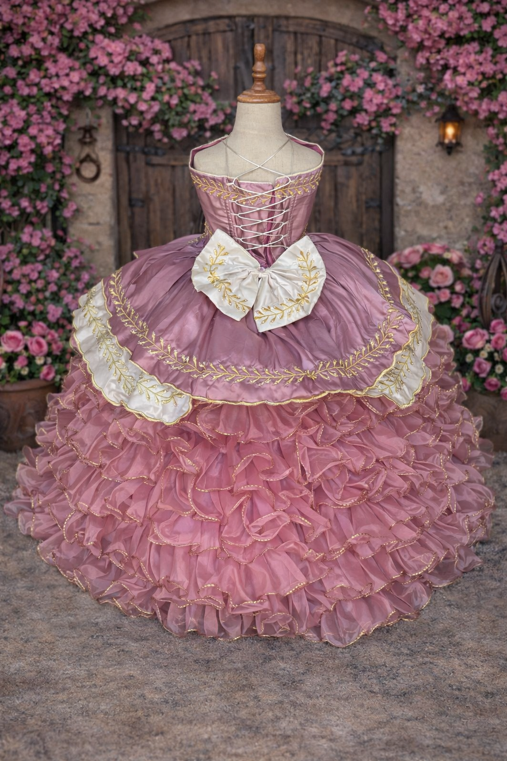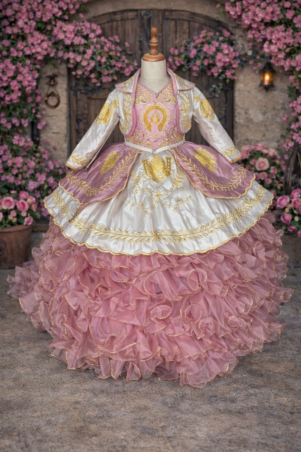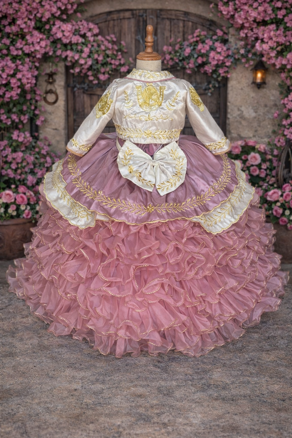 This elegant Charro-themed gown is a beautiful celebration of tradition and style. The 2-in-1 dress features a full, ruffled skirt layered with delicate fabric and adorned with intricate gold embroidery, including classic horse motifs. The fitted bodice showcases coordinating gold embroidery and a charming tie detail at the back.