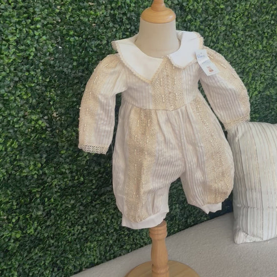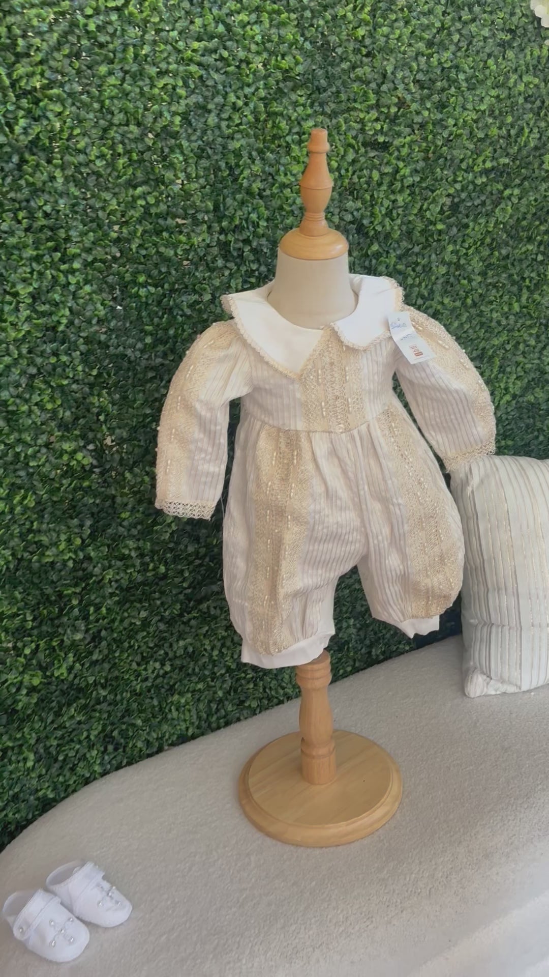 This classic 2-in-1 baptism style for boys is thoughtfully designed to combine tradition and comfort. The outer gown creates a timeless ceremonial look and can be easily removed to reveal a romper underneath, making it ideal for extended wear after the ceremony.