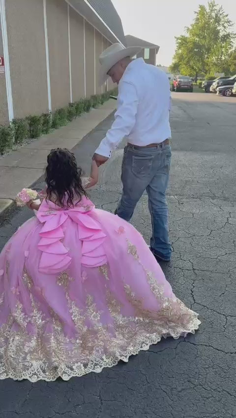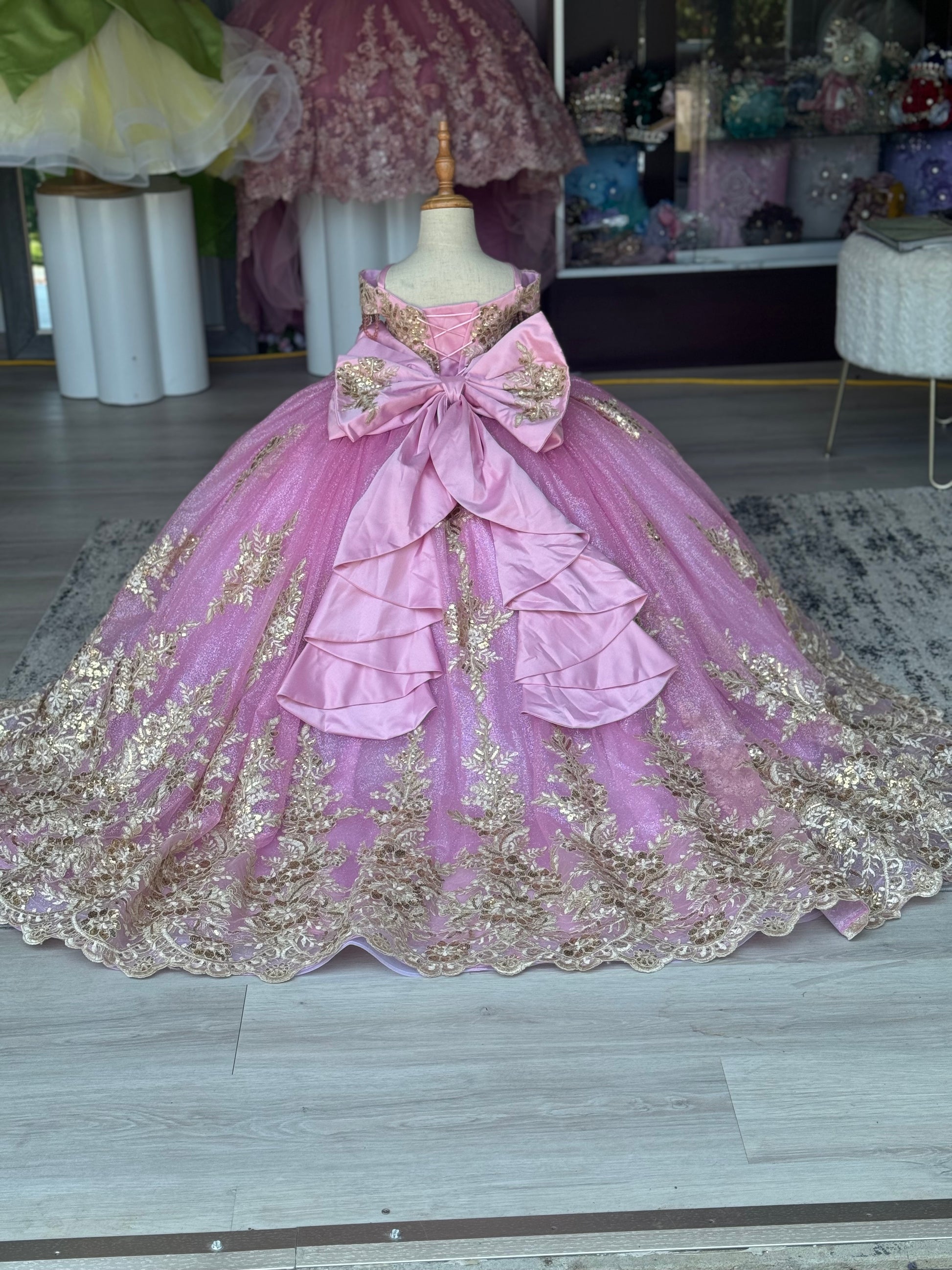 This enchanting 2-in-1 gown is designed for a truly magical celebration. The full, voluminous skirt shimmers with a beautiful glitter finish and is adorned with intricate floral lace appliqué. The elegant bodice features delicate, off-the-shoulder sleeves and a sophisticated corset-style lace-up back for a perfect fit. A large, luxurious satin bow completes the back, adding a touch of classic charm.