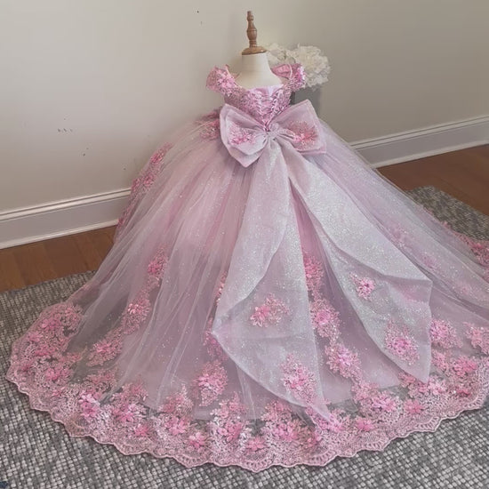 This 2-in-1 dress offers versatile elegance. The ornate corset bodice features off-the-shoulder straps and shimmering floral details. A voluminous, multi-layered glittery tulle skirt transforms from a grand ball gown with cascading lace appliqués to a playful ballet tutu with a detachable overlay and decorative back bow.