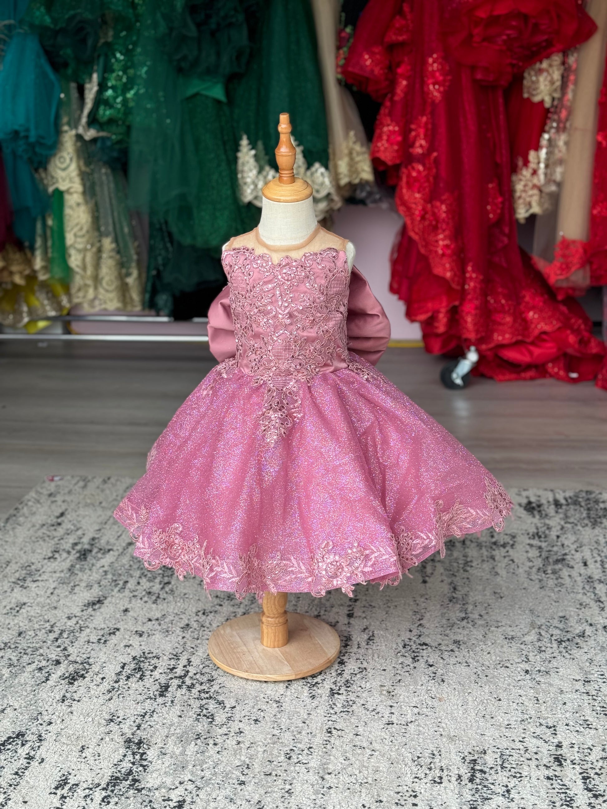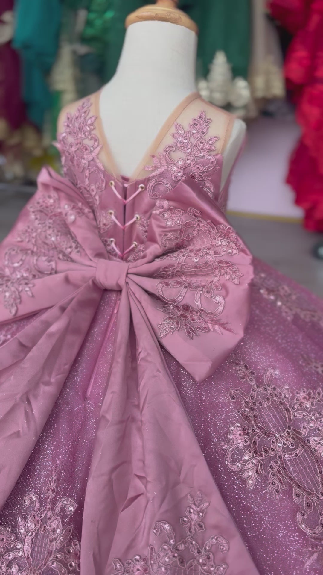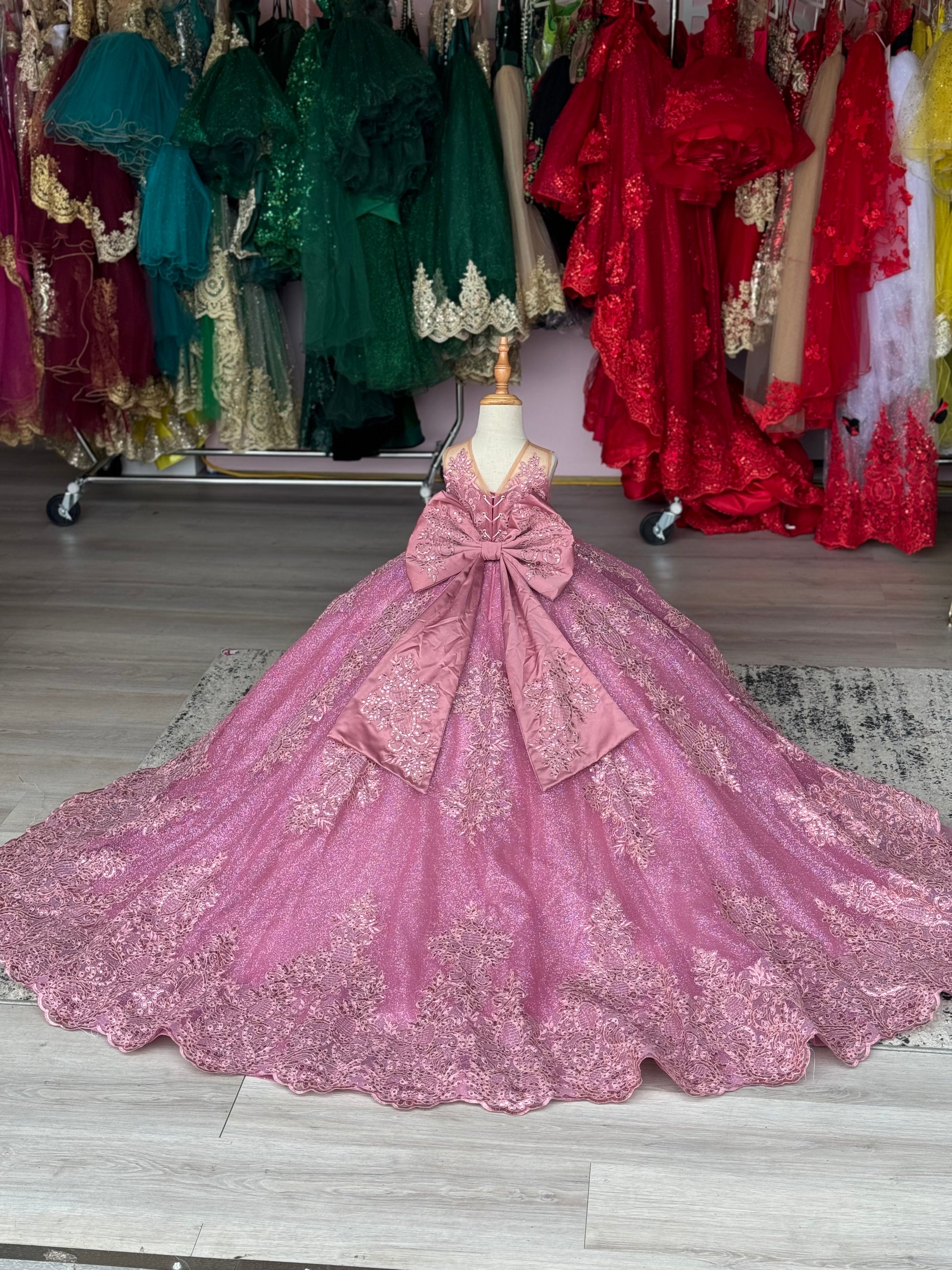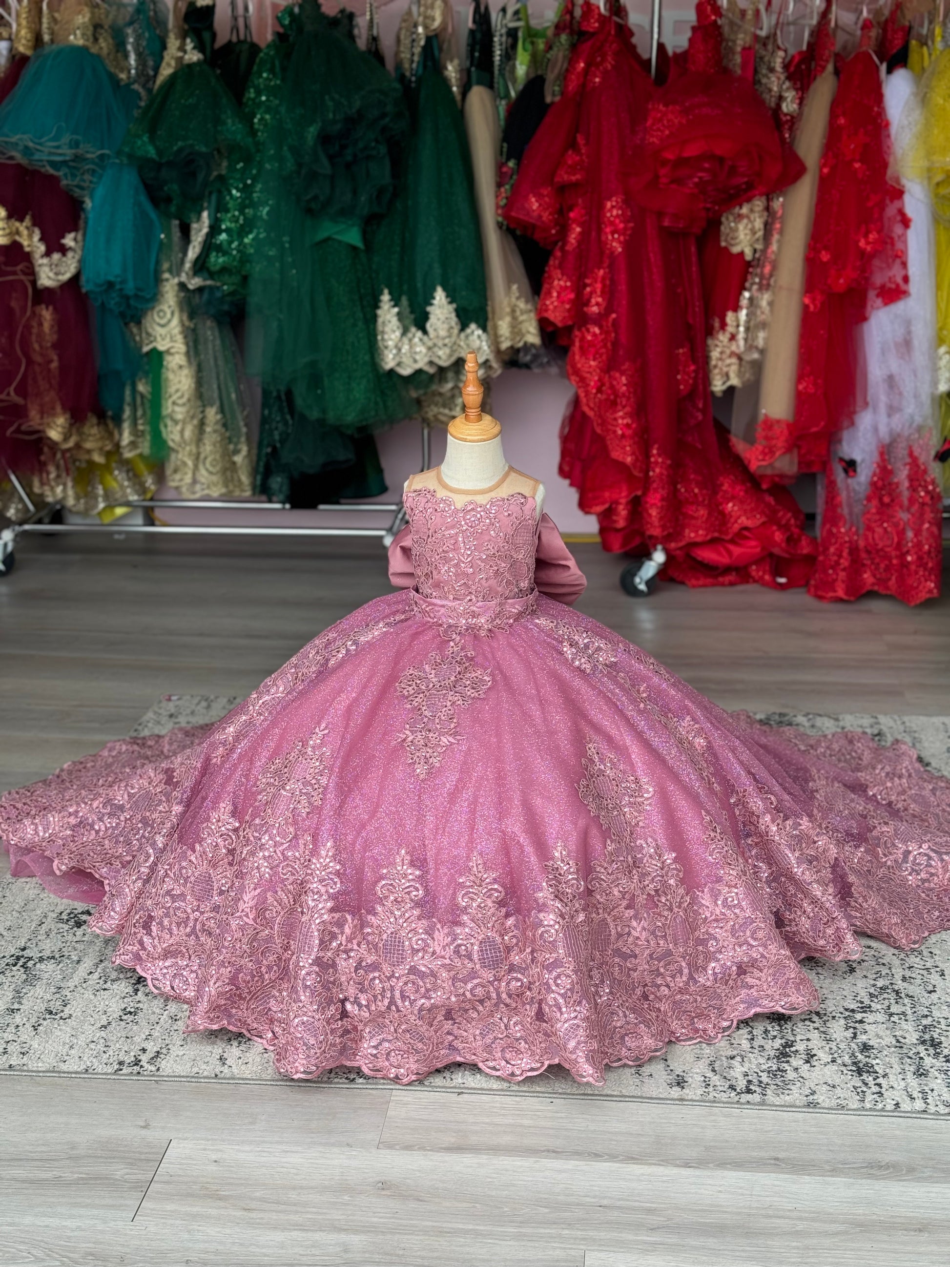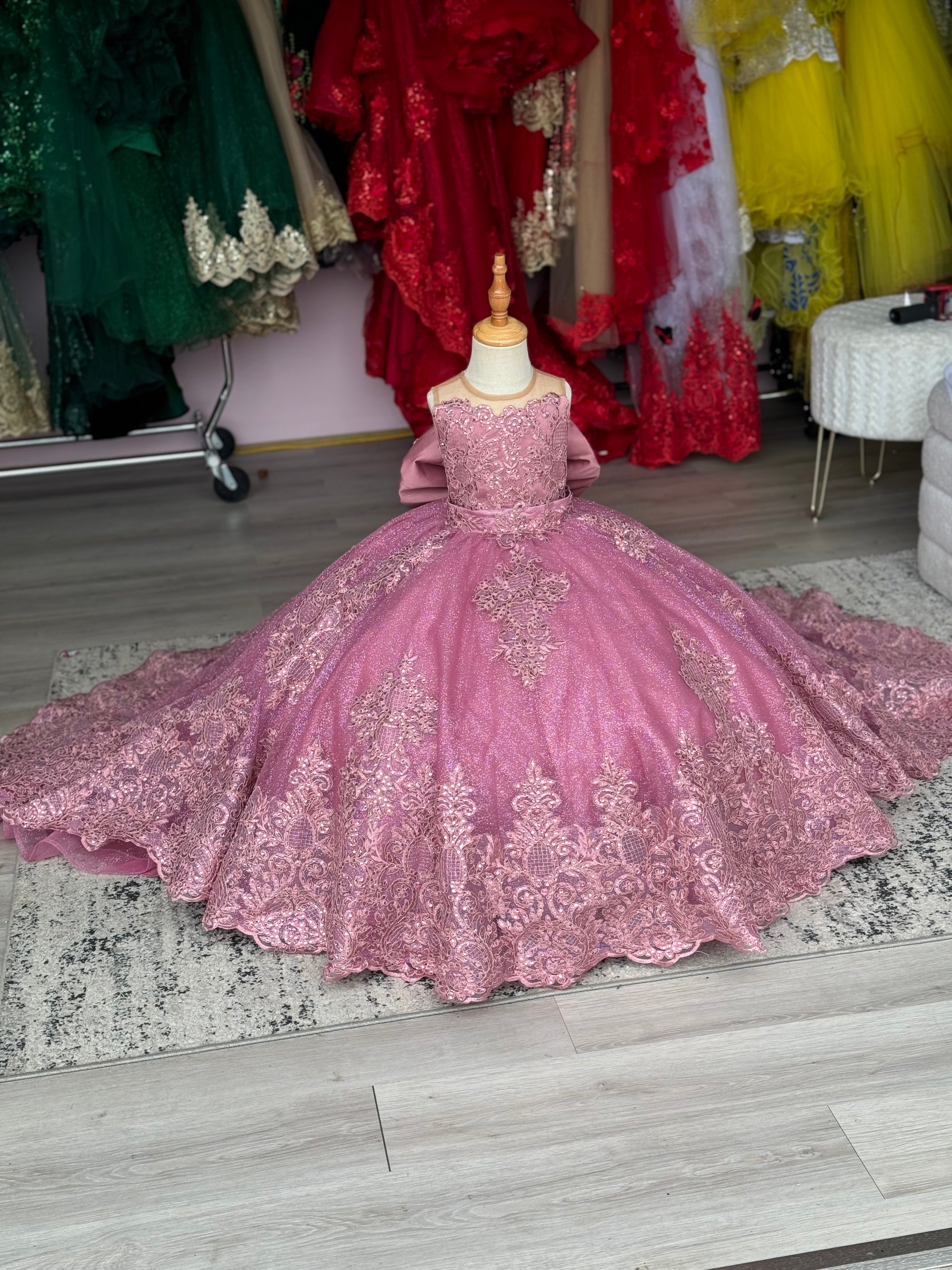 A dreamy mauve ball gown designed for a true little princess. This stunning 2-in-1 style features a full glitter tulle skirt with delicate lace appliqué and a dramatic detachable cathedral-length train for two beautiful looks in one. The bodice is adorned with soft lace details and finished with an oversized satin statement bow at the back for an elegant, royal touch.