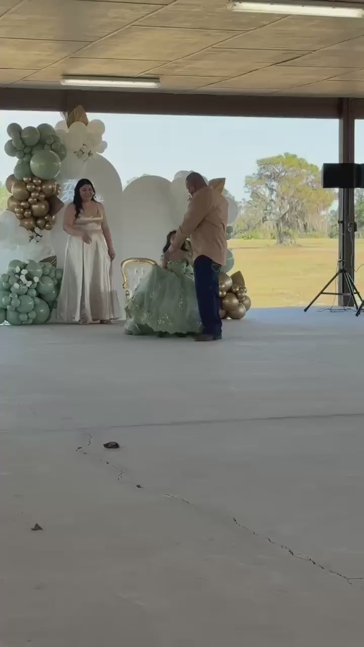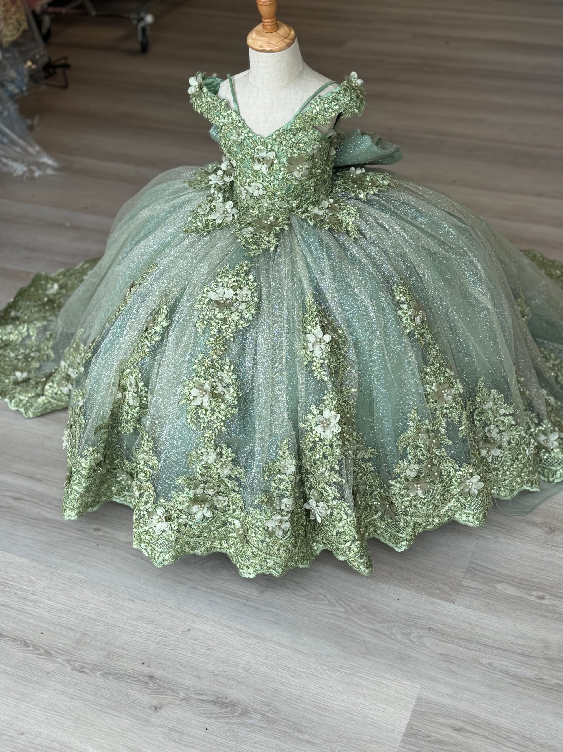 This 2-in-1 dress offers versatile elegance. The ornate corset bodice features off-the-shoulder straps and shimmering floral details. A voluminous, multi-layered glittery tulle skirt transforms from a grand ball gown with cascading lace appliqués to a playful ballet tutu with a detachable overlay and decorative back bow.