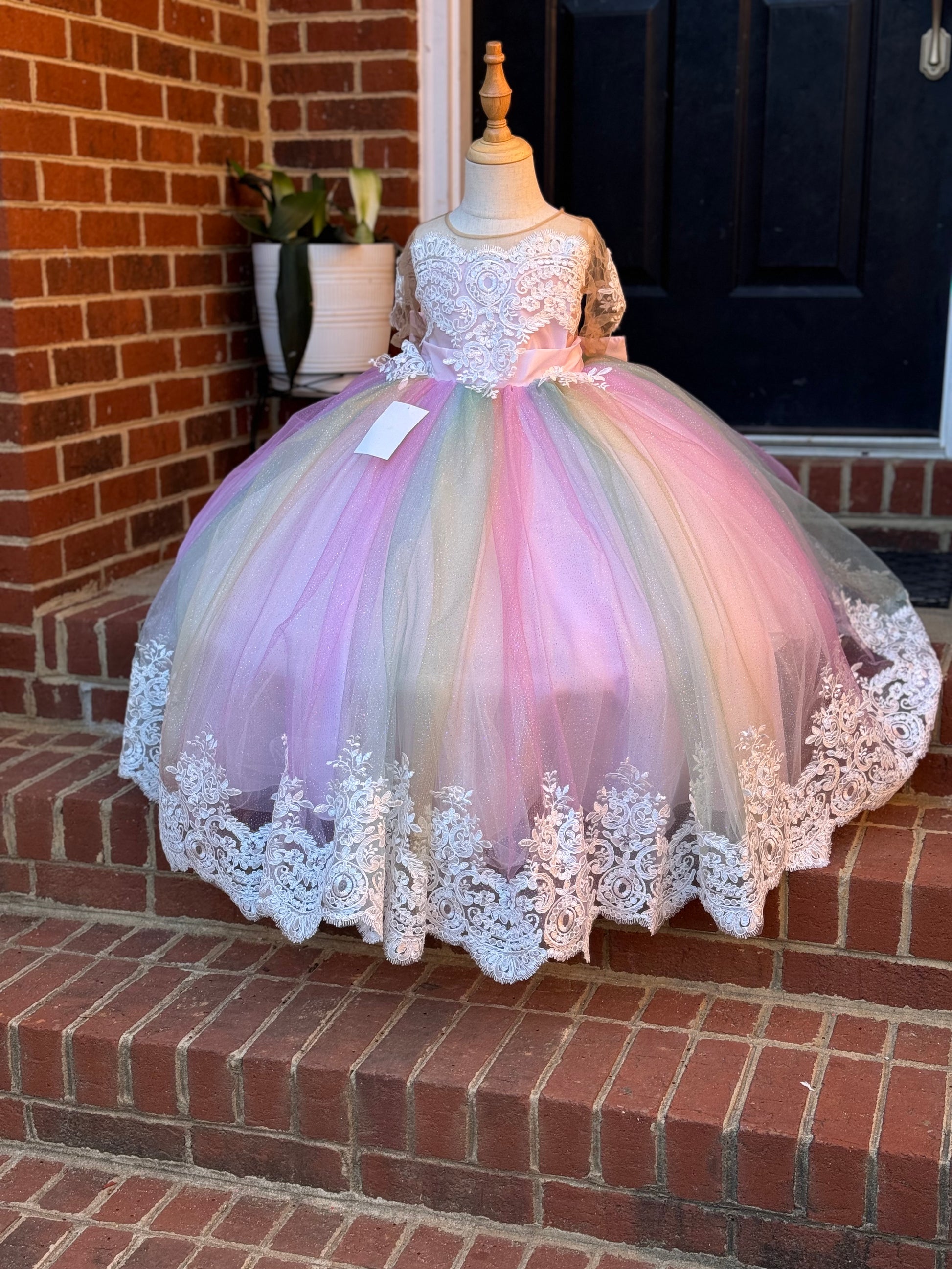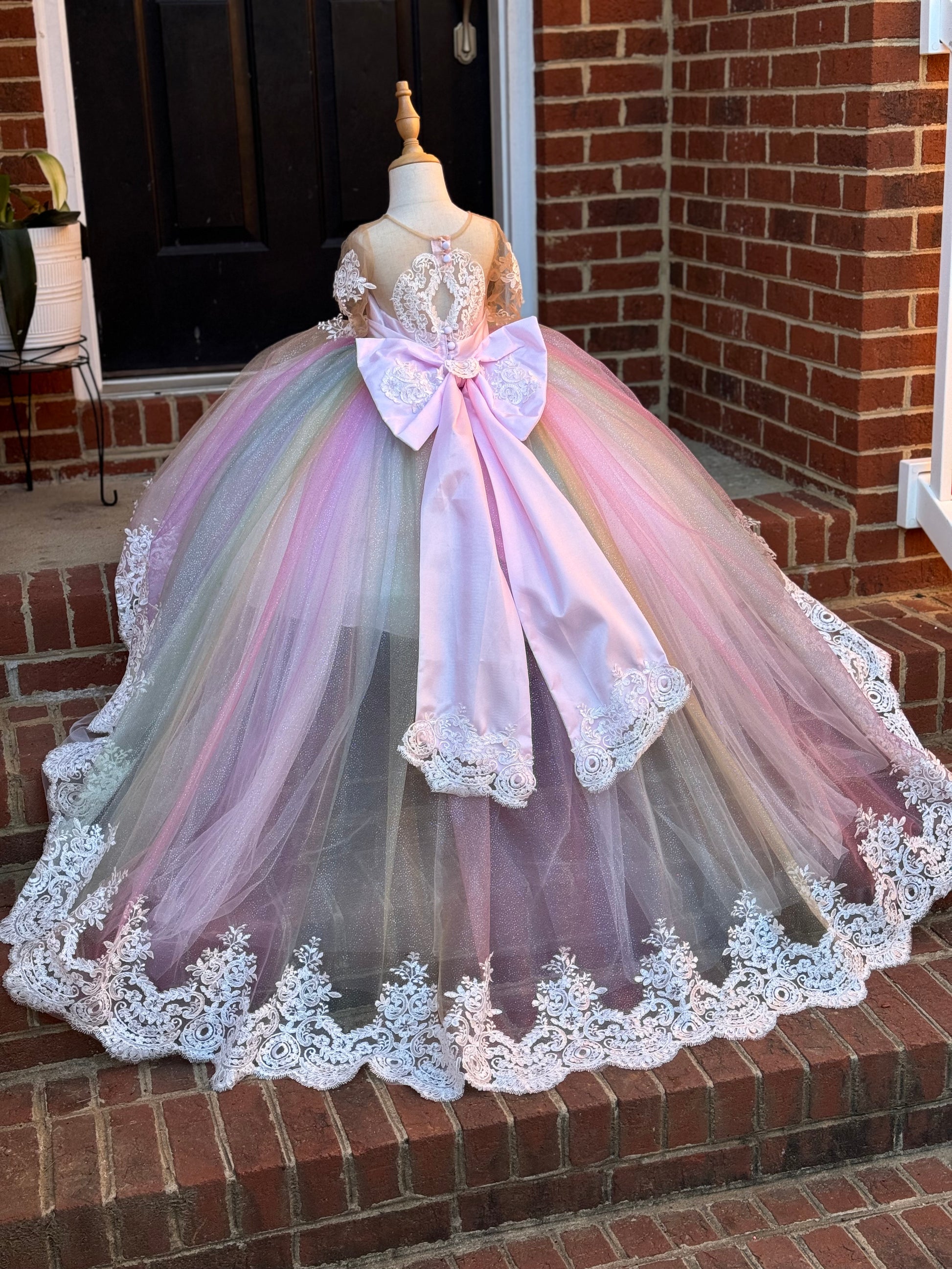 This stunning gown is a fairytale-inspired masterpiece, perfect for any special occasion. The dress features a full glitter tulle skirt that is sure to sparkle with every step, making it ideal for a grand entrance.