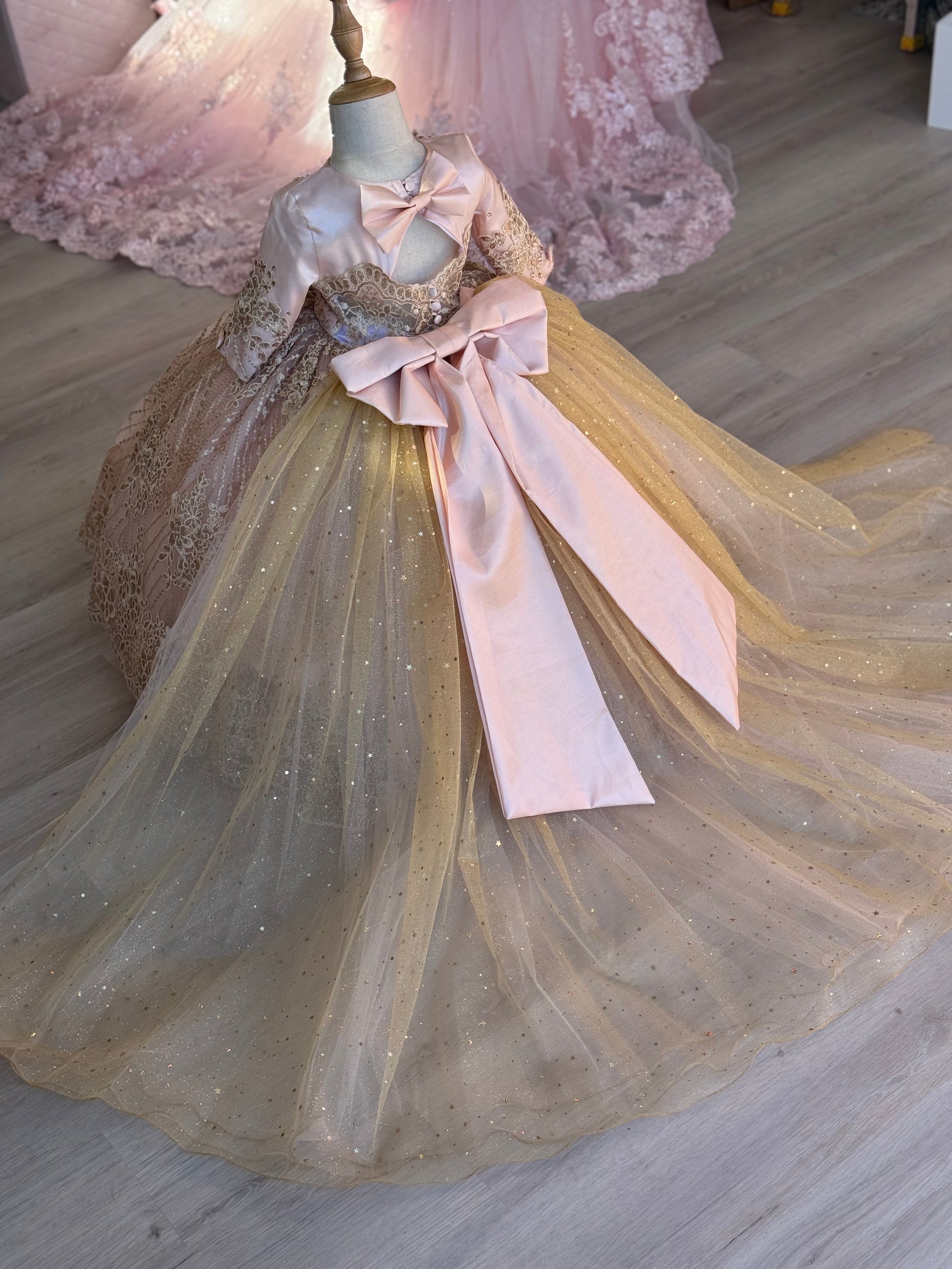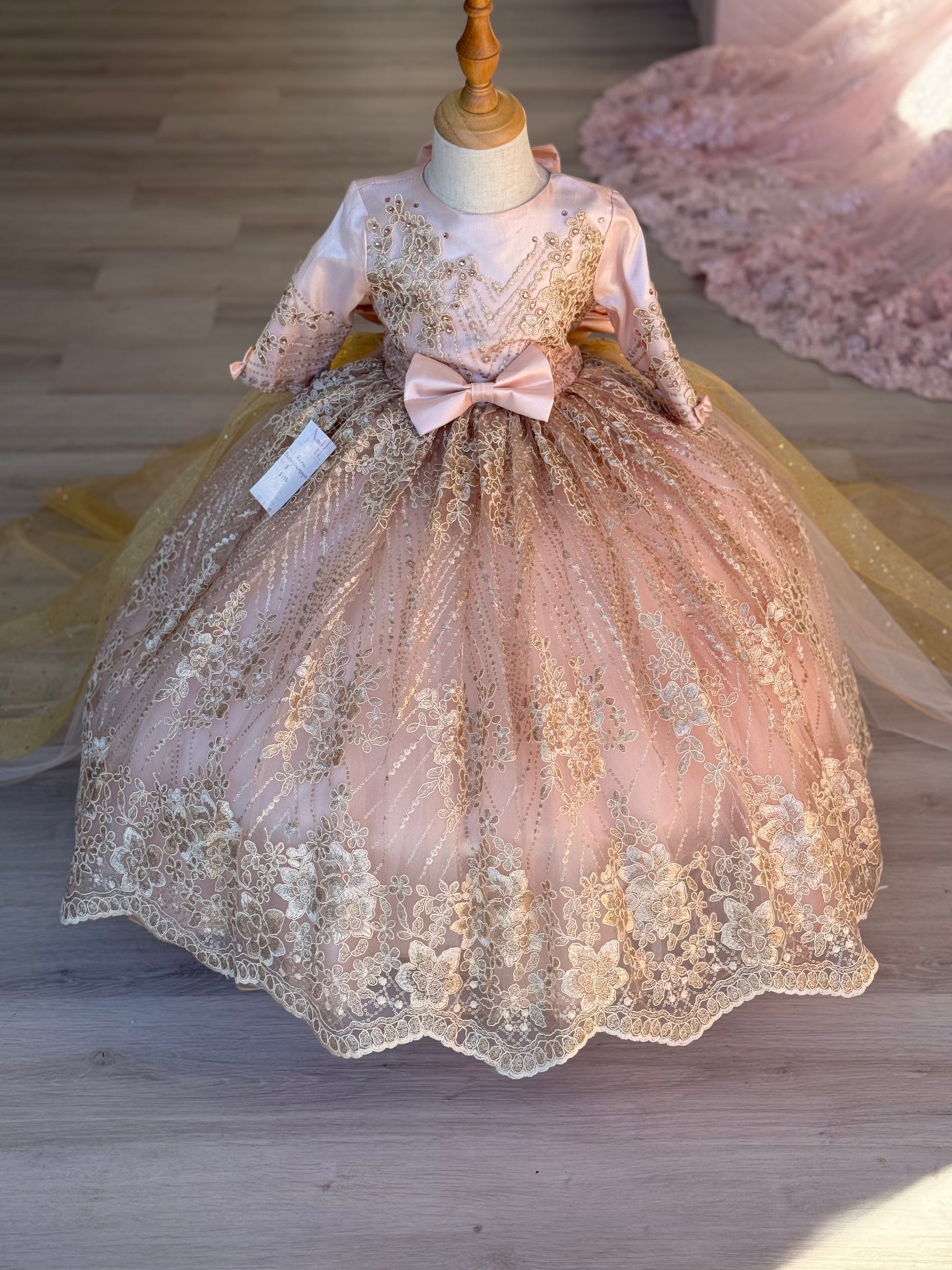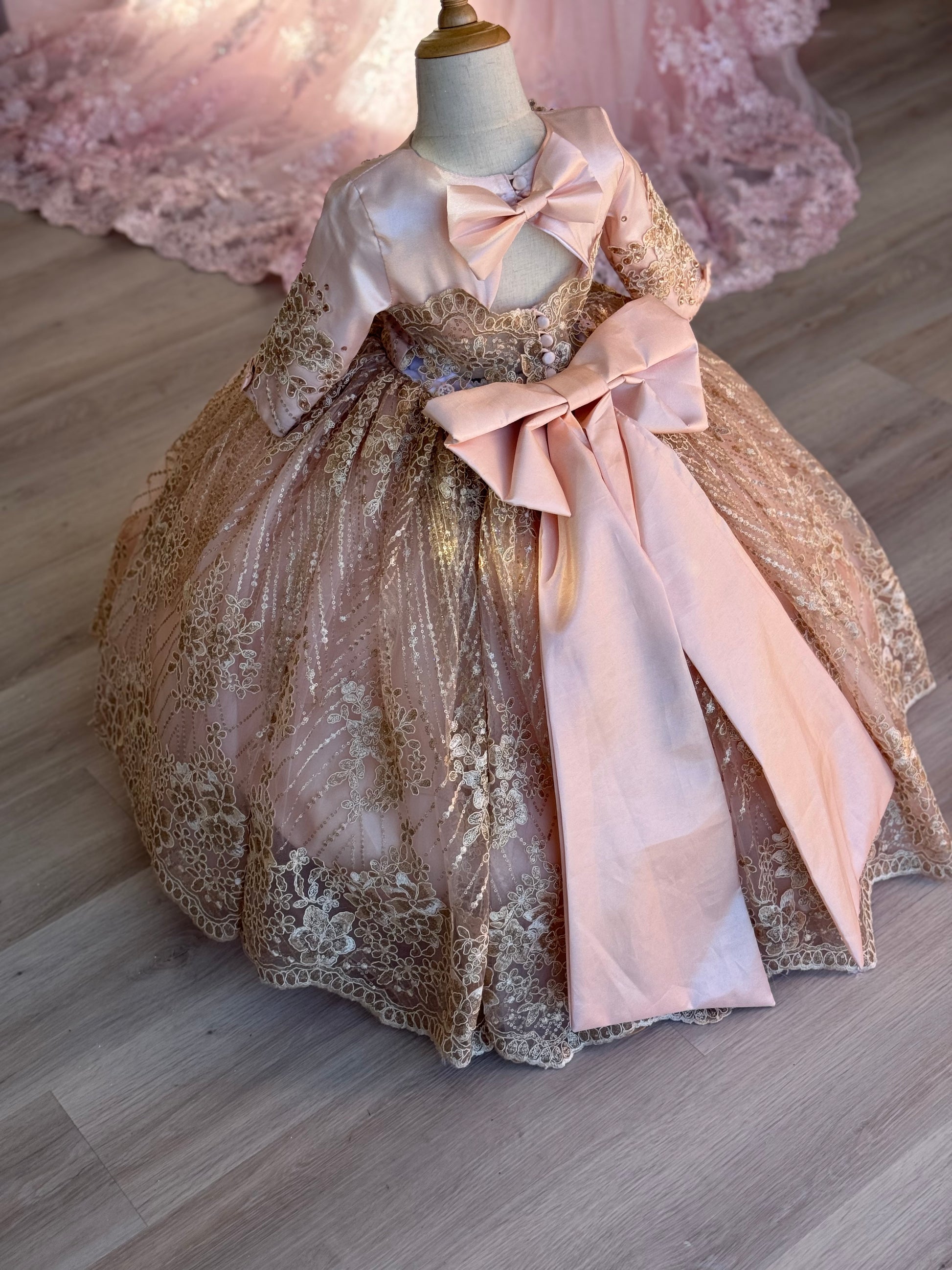 A captivating gown that radiates classic elegance and stunning detail. The bodice features a classic sweetheart neckline and long sleeves, beautifully adorned with intricate beaded floral and leaf patterns that cascade across the front. The skirt is a voluminous masterpiece, made from a creation that shimmers and sparkles with every graceful movement. A wide band of matching beaded floral and leaf patterns circles the hem, adding a final touch of sophistication. A magnificent train can be attached for a grand entrance or detached for ease of movement. The back is completed with a beautiful bow and a classic button-up closure, ensuring a timeless and comfortable fit.