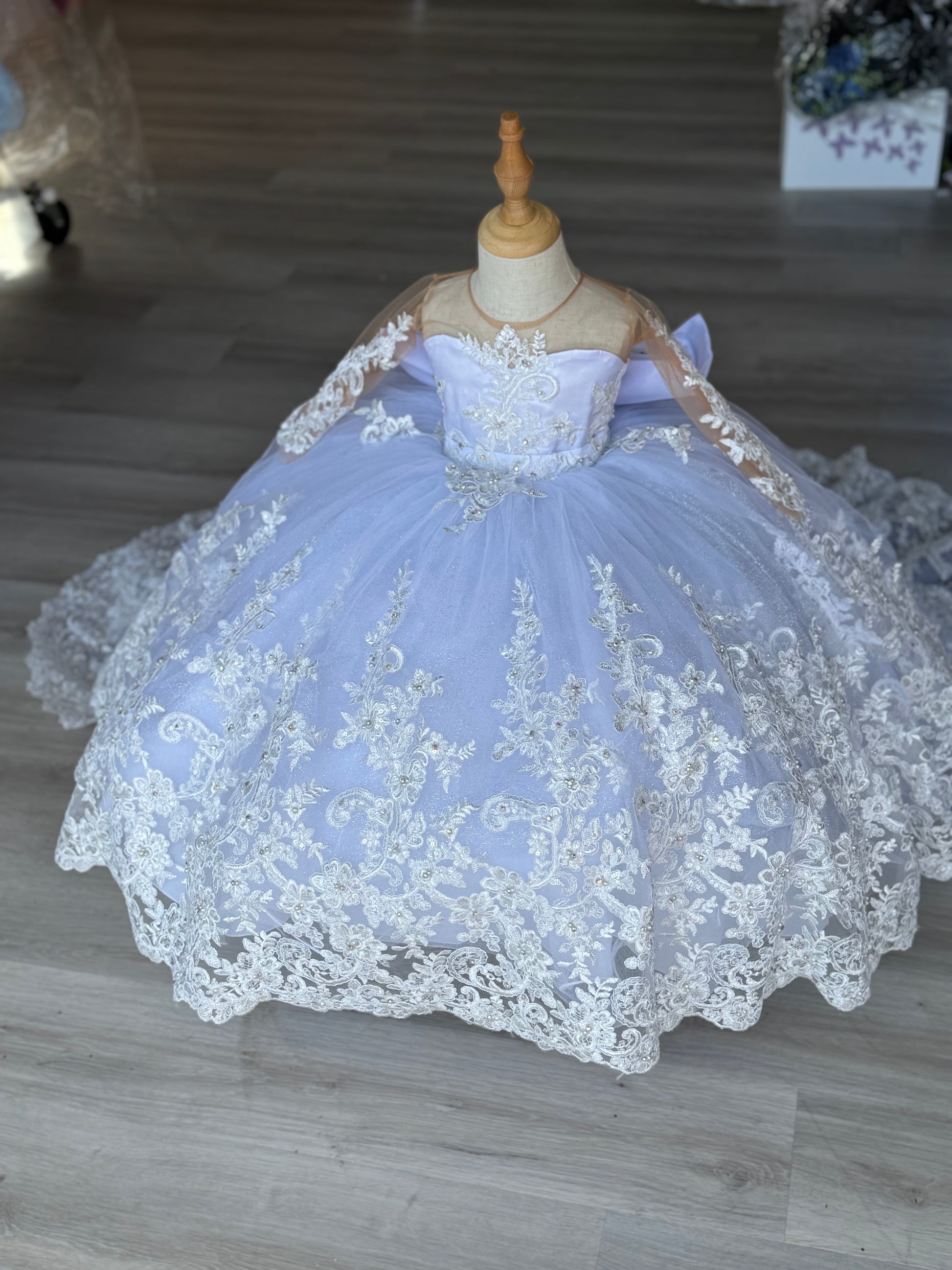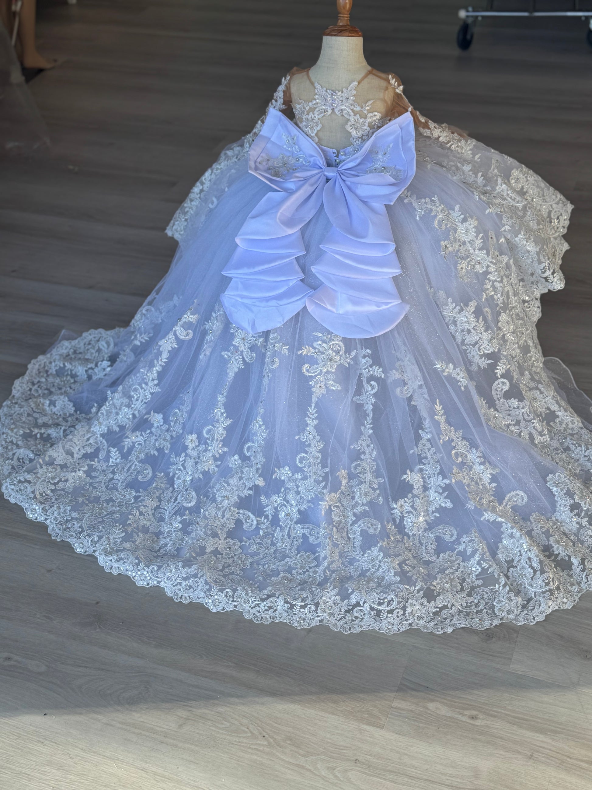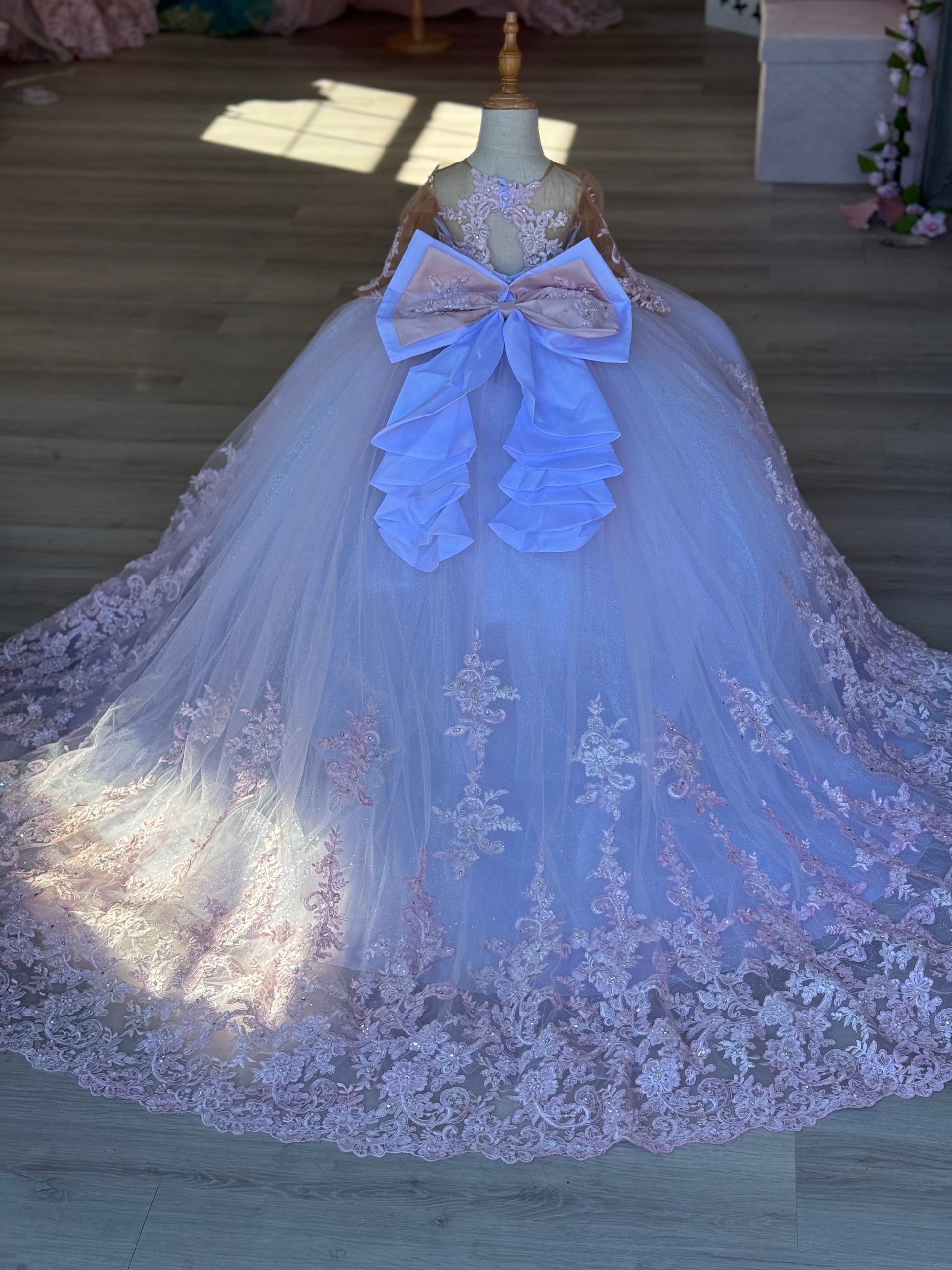 "This majestic 2-in-1 gown is a vision of elegance and grandeur. The full, voluminous skirt shimmers with a glitter finish and is beautifully adorned with intricate lace appliqué that creates a stunning border and sweeping train. The fitted bodice features matching lace over a sheer top, complemented by delicate long sleeves. The back of the gown showcases an elaborate, oversized bow, adding a touch of classic charm.
