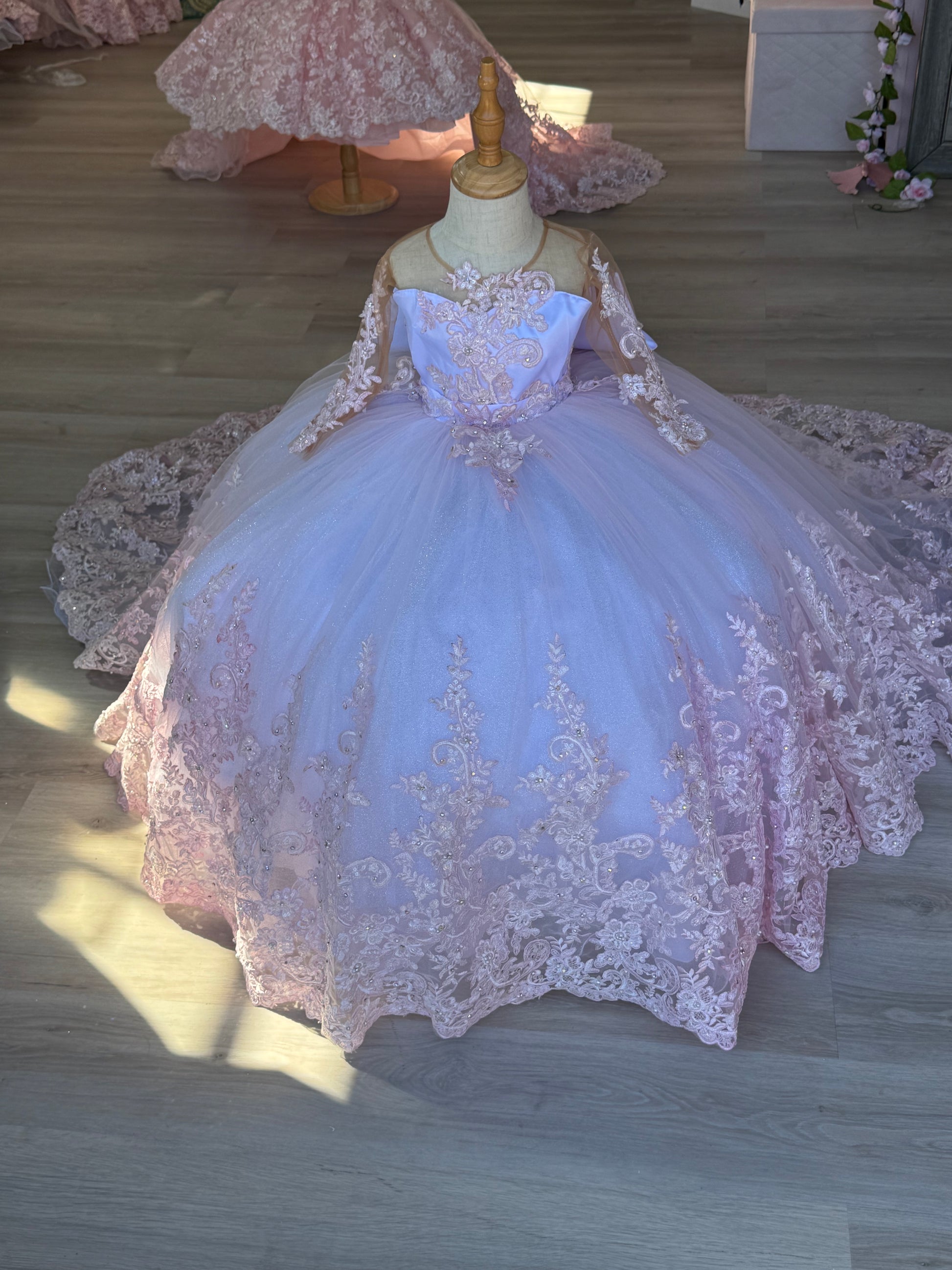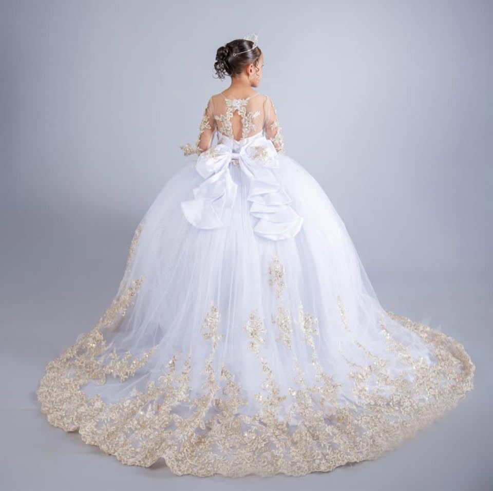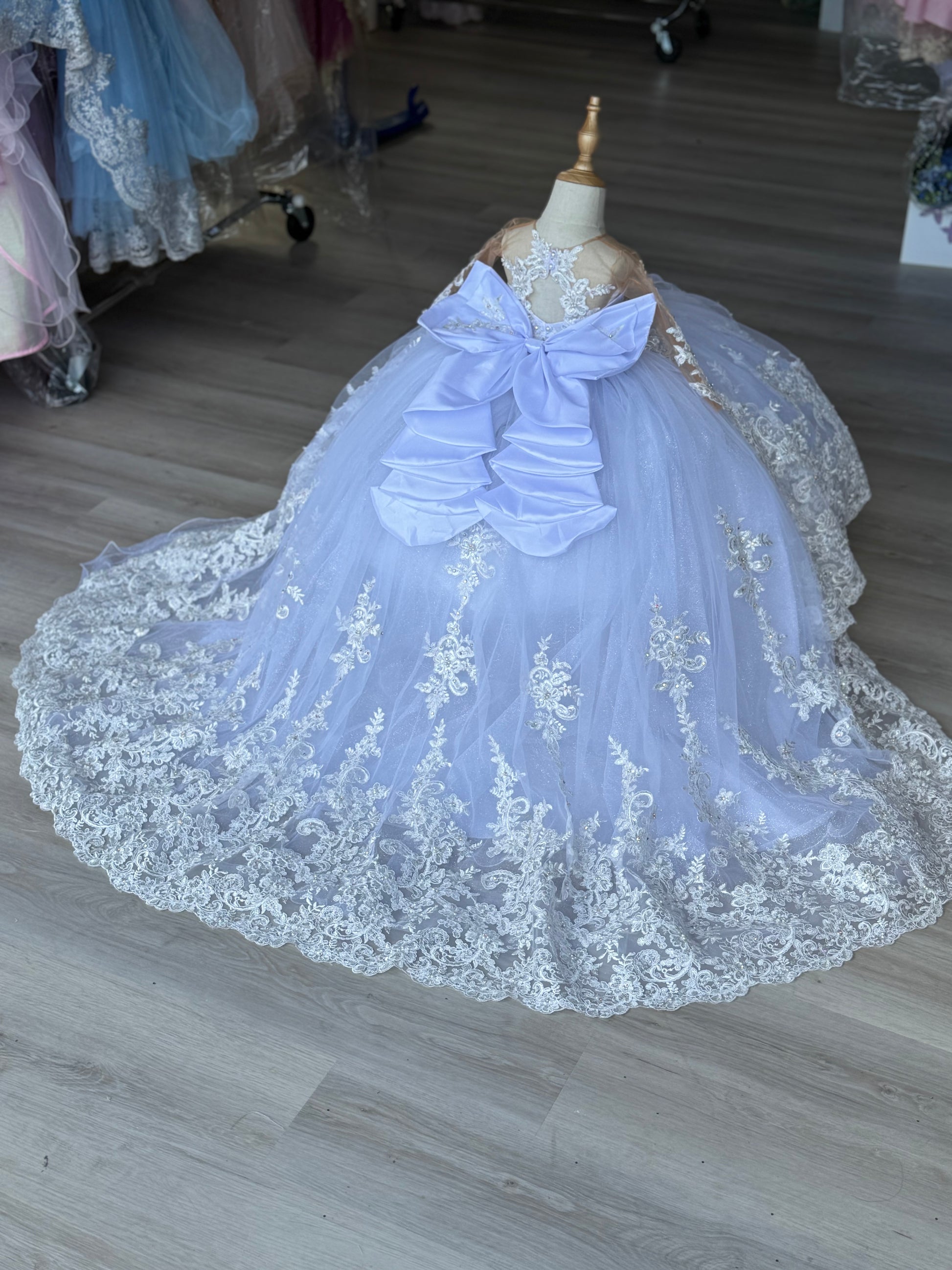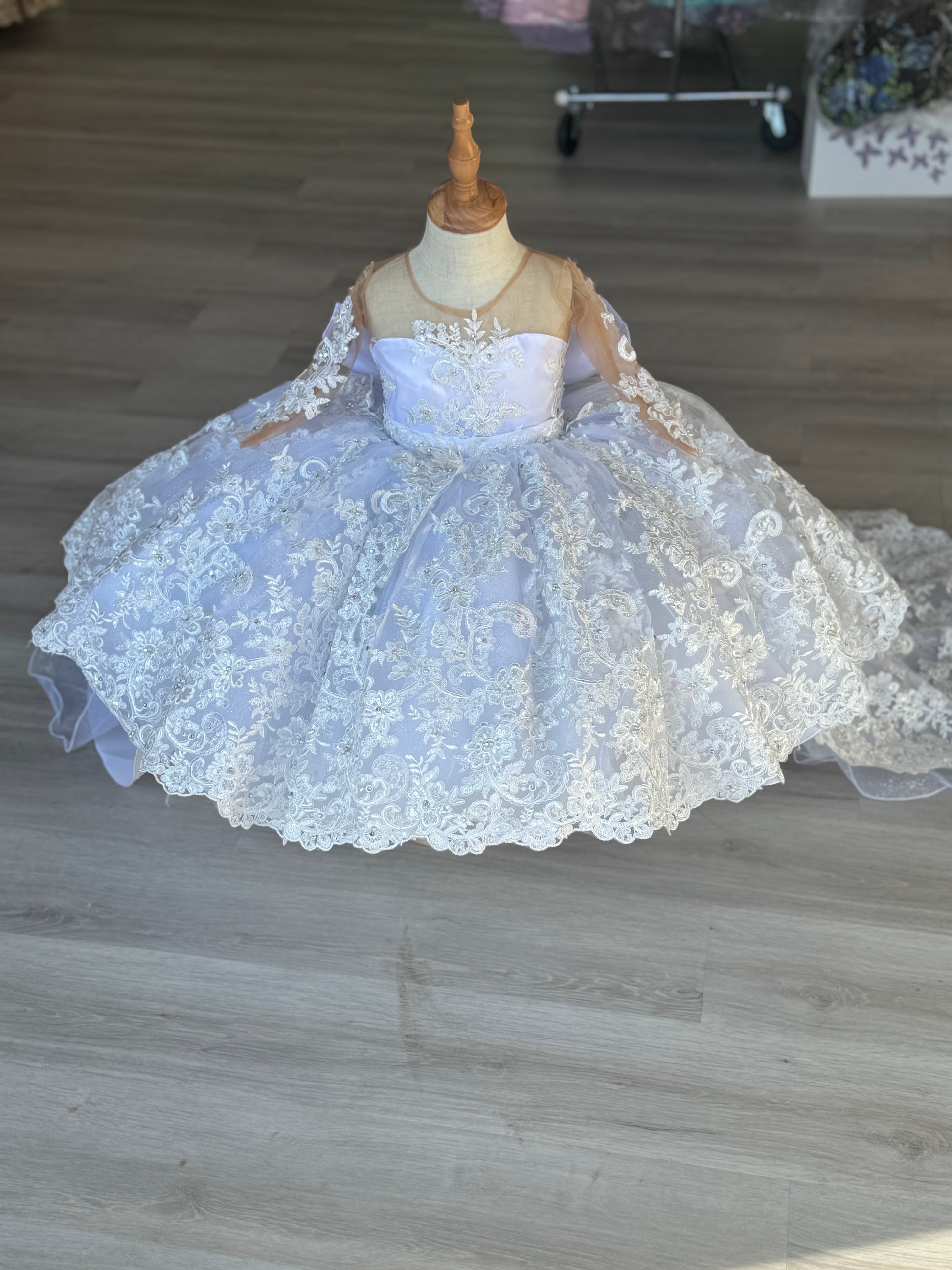 "This majestic 2-in-1 gown is a vision of elegance and grandeur. The full, voluminous skirt shimmers with a glitter finish and is beautifully adorned with intricate lace appliqué that creates a stunning border and sweeping train. The fitted bodice features matching lace over a sheer top, complemented by delicate long sleeves. The back of the gown showcases an elaborate, oversized bow, adding a touch of classic charm.