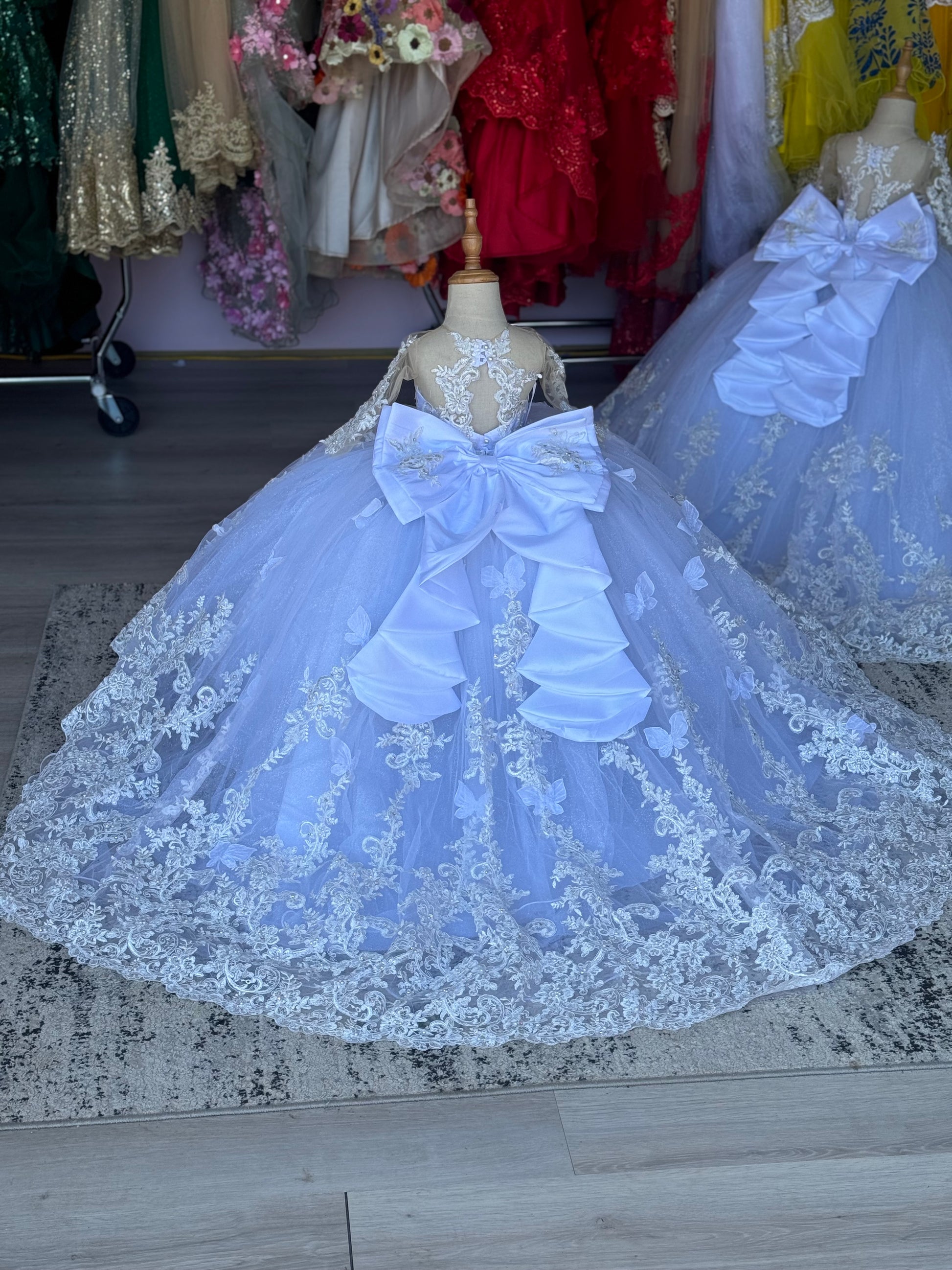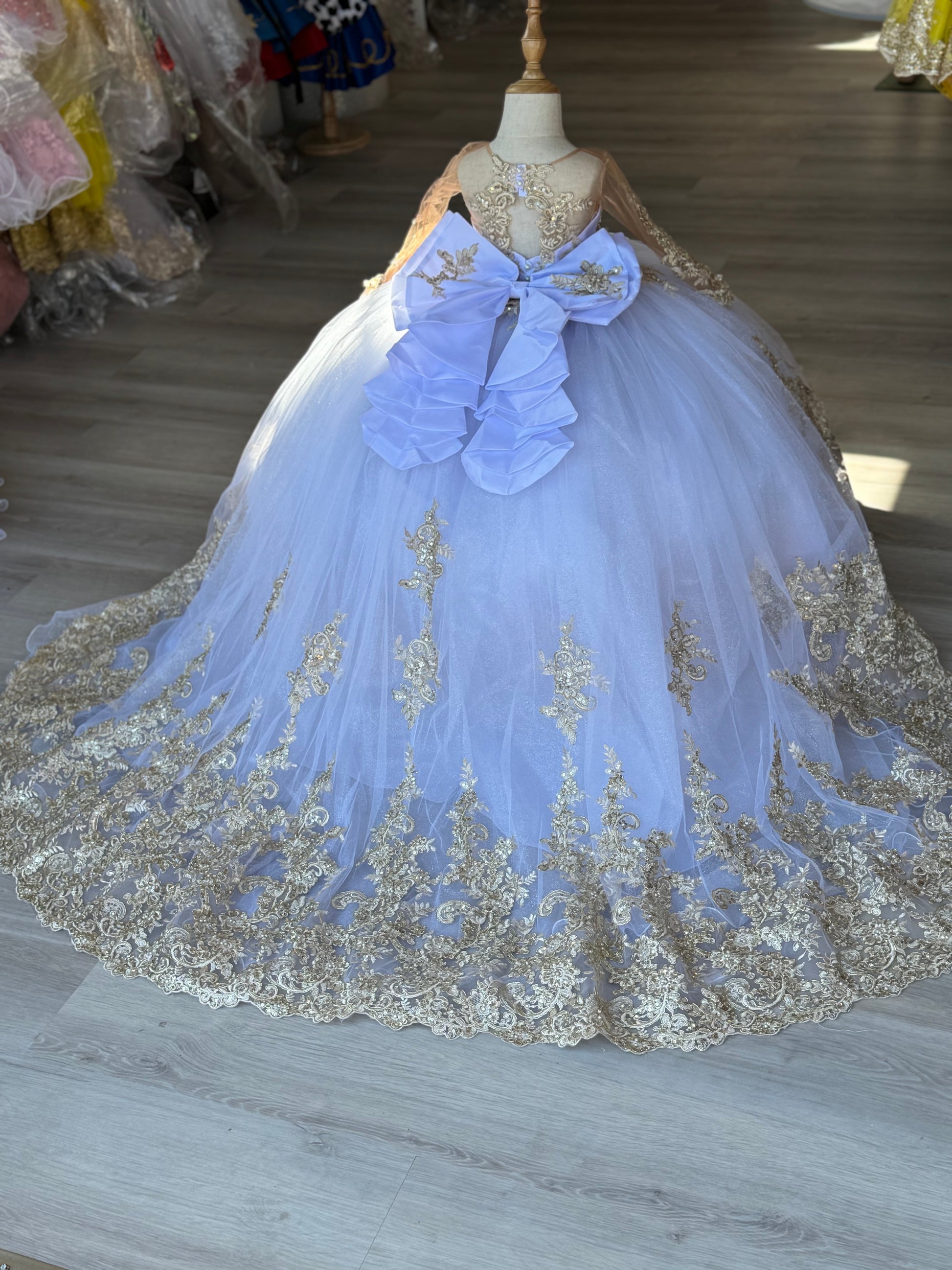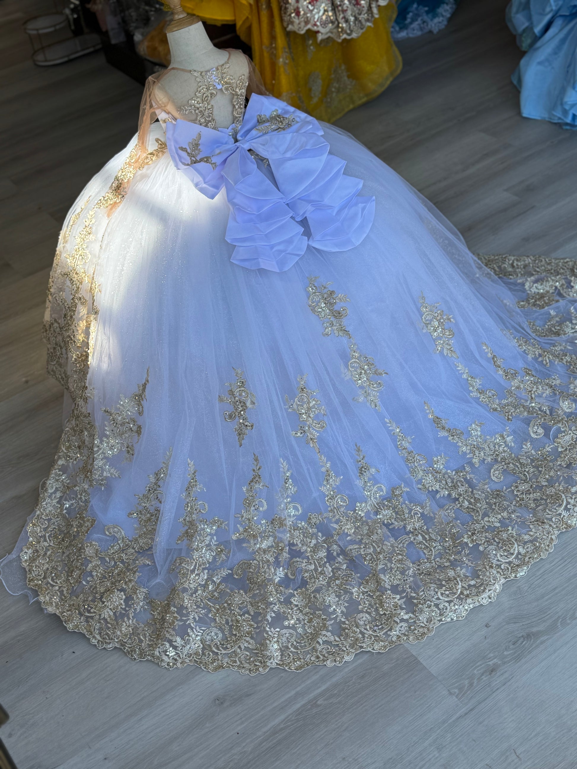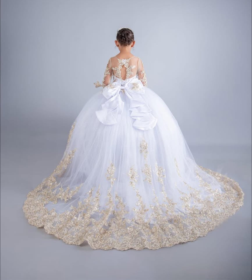 "This majestic 2-in-1 gown is a vision of elegance and grandeur. The full, voluminous skirt shimmers with a glitter finish and is beautifully adorned with intricate lace appliqué that creates a stunning border and sweeping train. The fitted bodice features matching lace over a sheer top, complemented by delicate long sleeves. The back of the gown showcases an elaborate, oversized bow, adding a touch of classic charm.