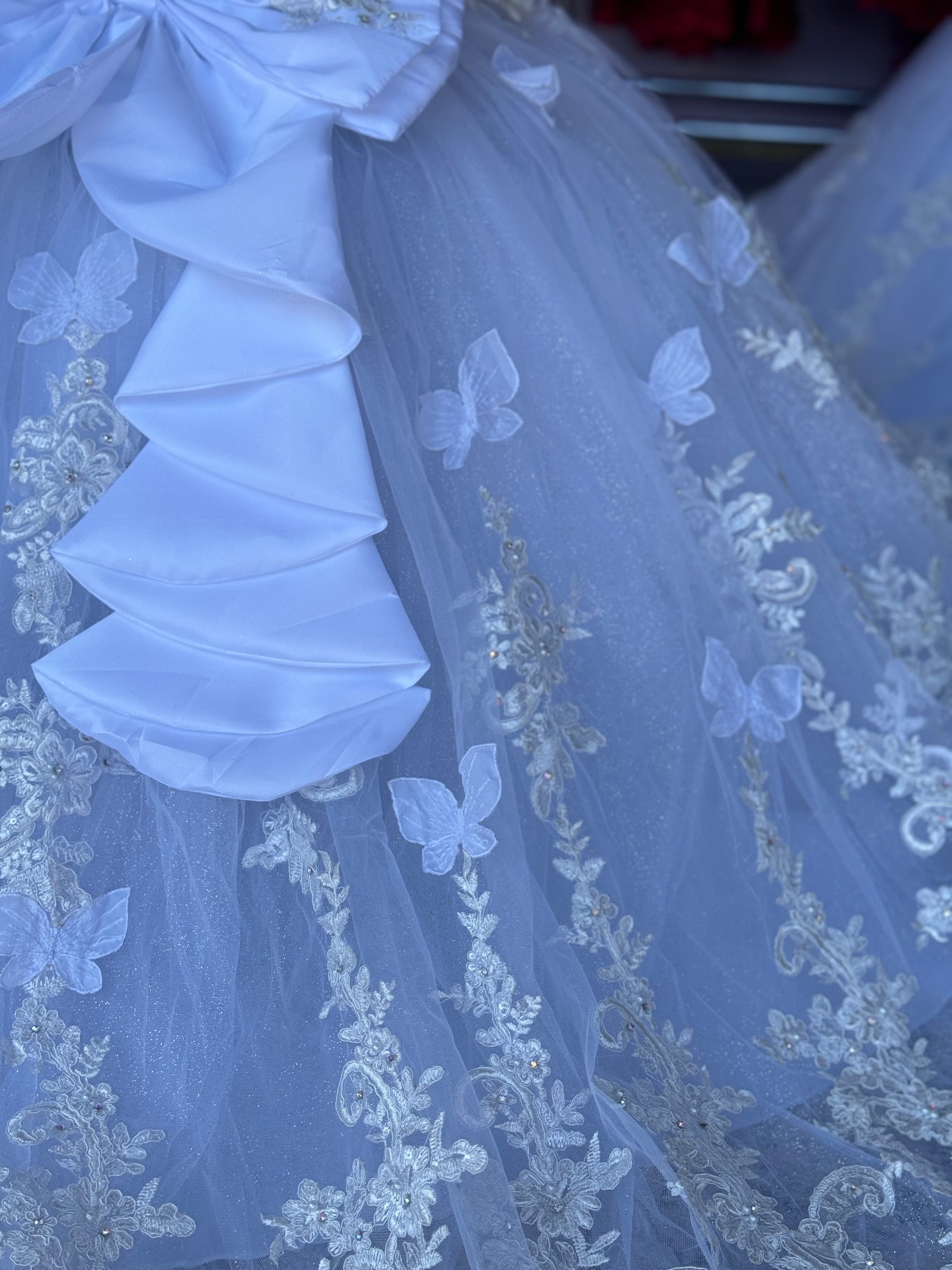 - Add Butterfly Appliqués: For an additional cost, you can add whimsical butterfly appliqués to the skirt and bodice."