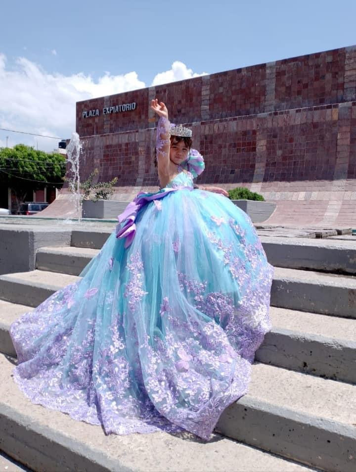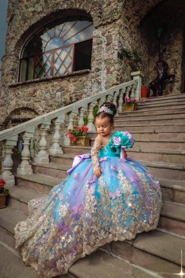 "This exquisite ball gown is designed to make any child feel like royalty. The full, flowing skirt is crafted with multiple layers to create a voluminous silhouette, while the fitted bodice is adorned with delicate lace appliqué.