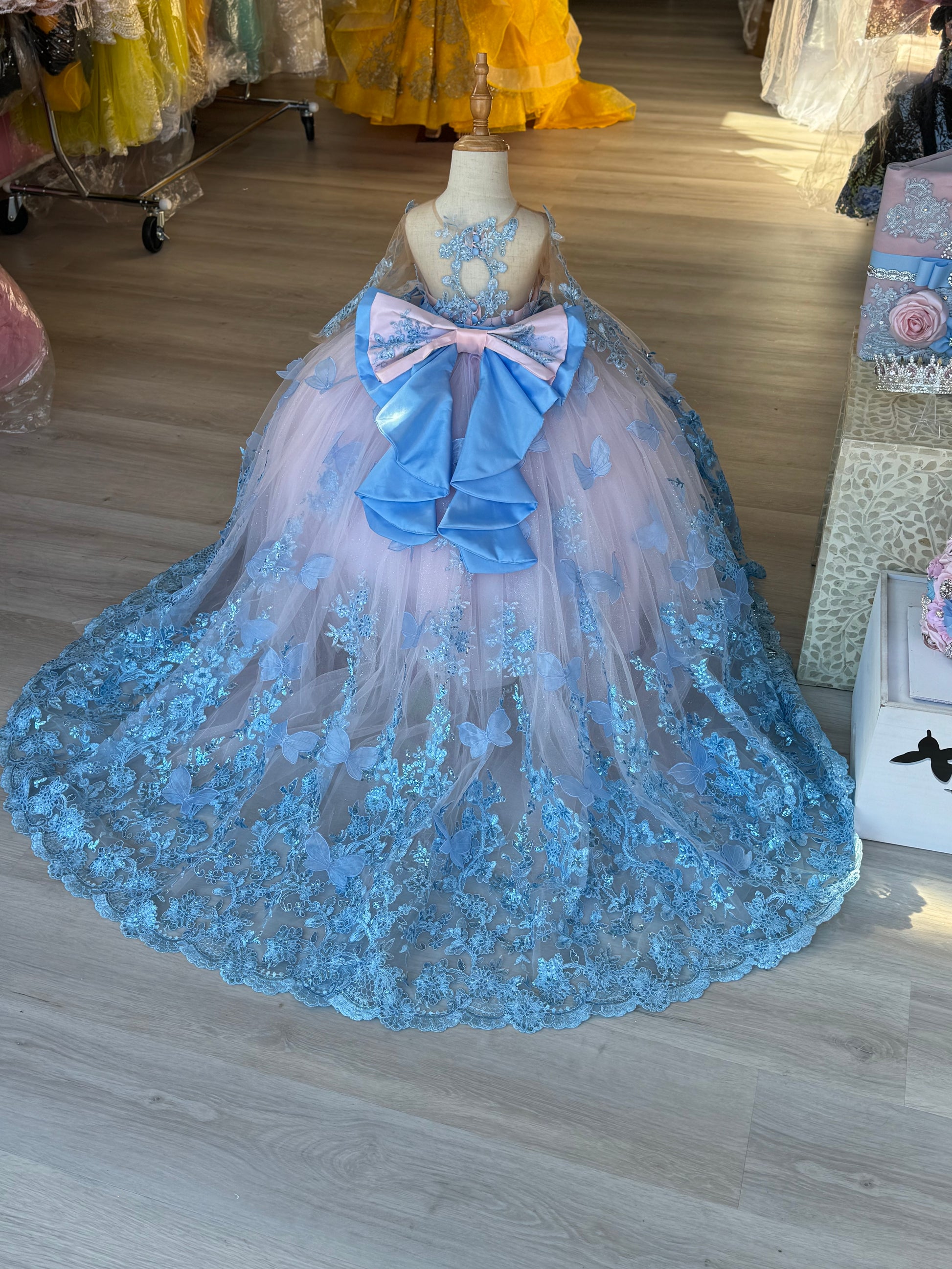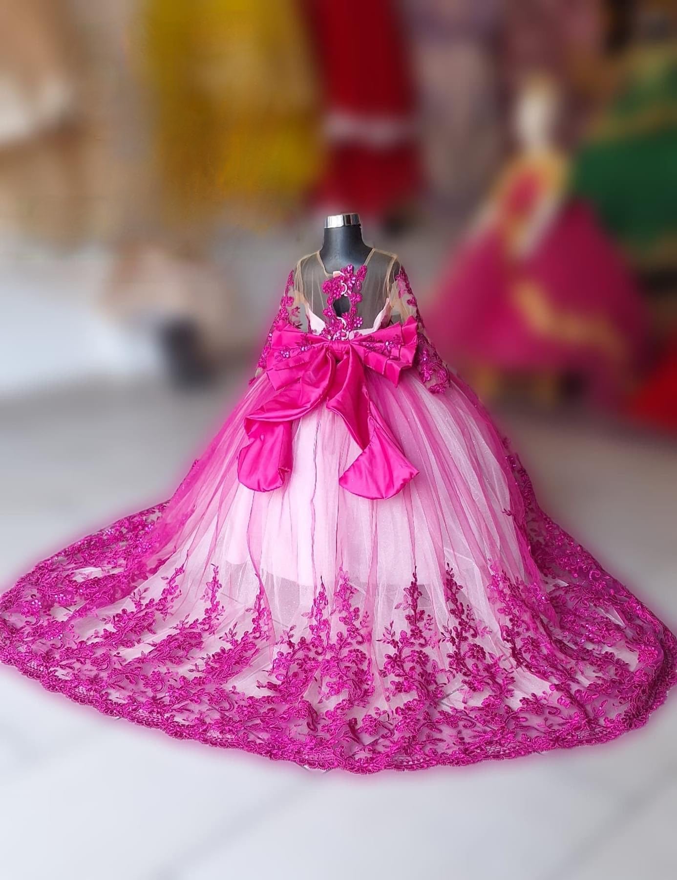 "This exquisite ball gown is designed to make any child feel like royalty. The full, flowing skirt is crafted with multiple layers to create a voluminous silhouette, while the fitted bodice is adorned with delicate lace appliqué.