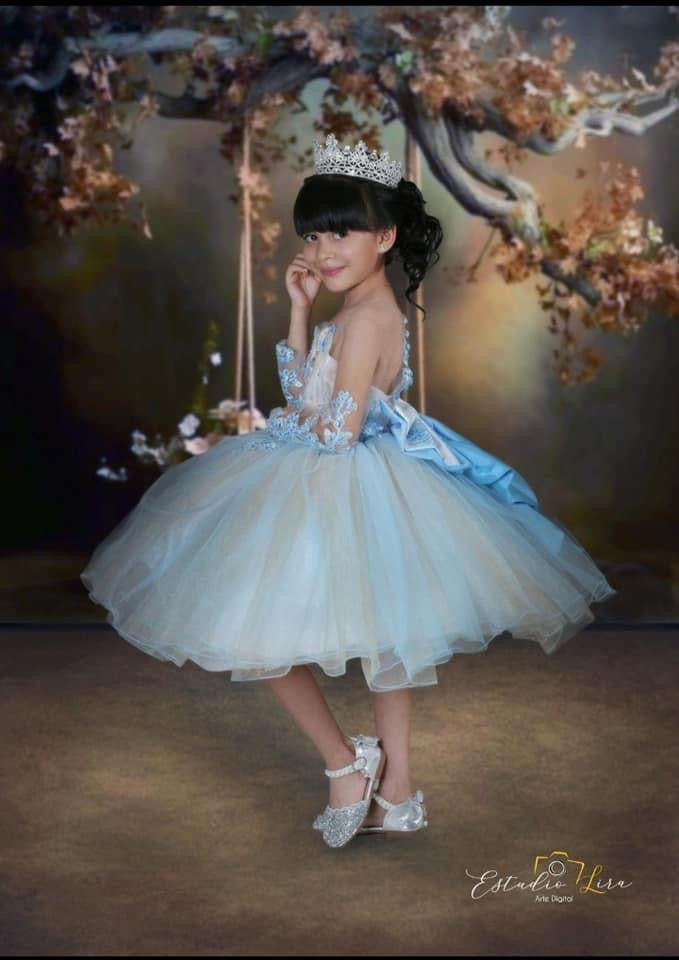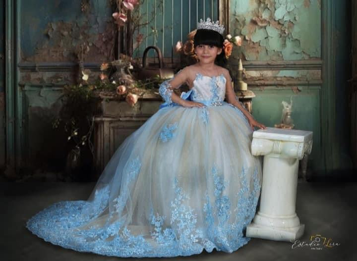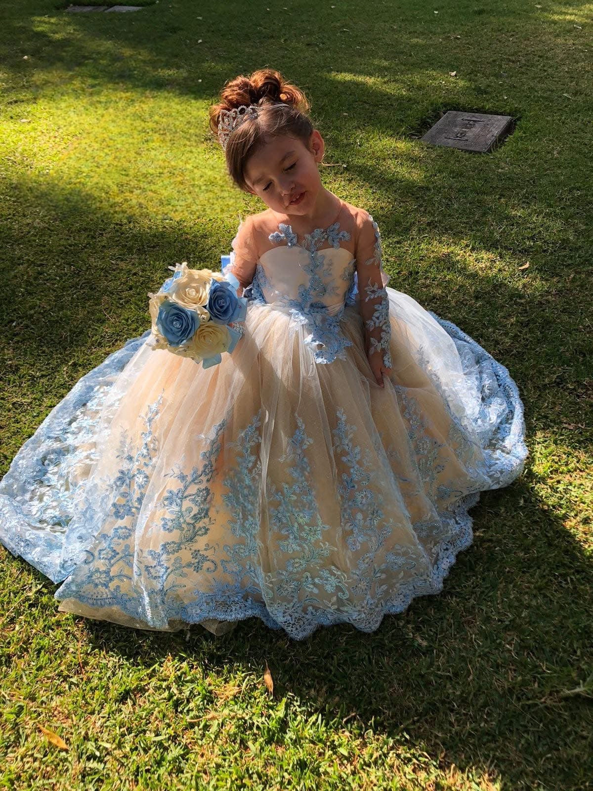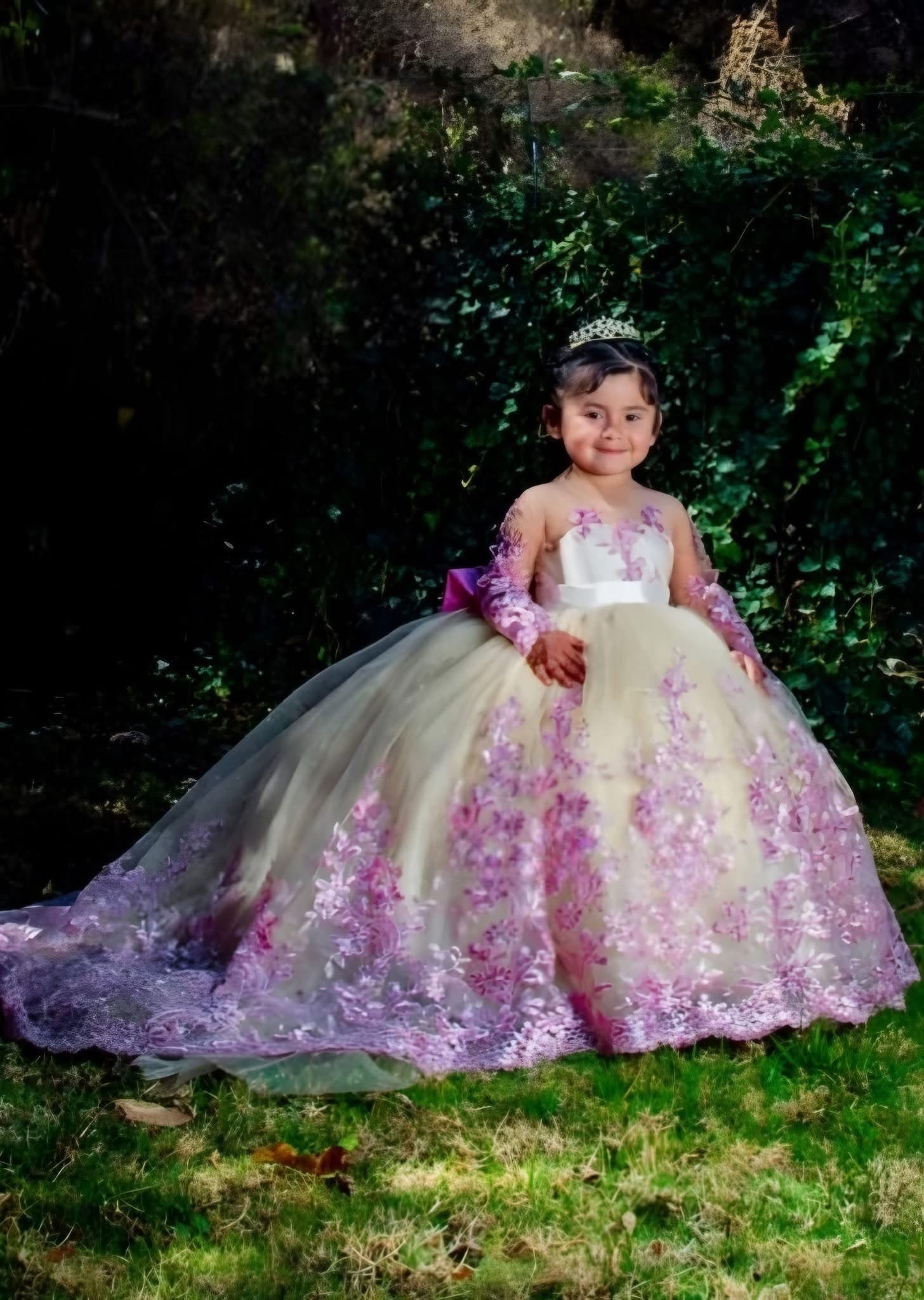 "This exquisite ball gown is designed to make any child feel like royalty. The full, flowing skirt is crafted with multiple layers to create a voluminous silhouette, while the fitted bodice is adorned with delicate lace appliqué.