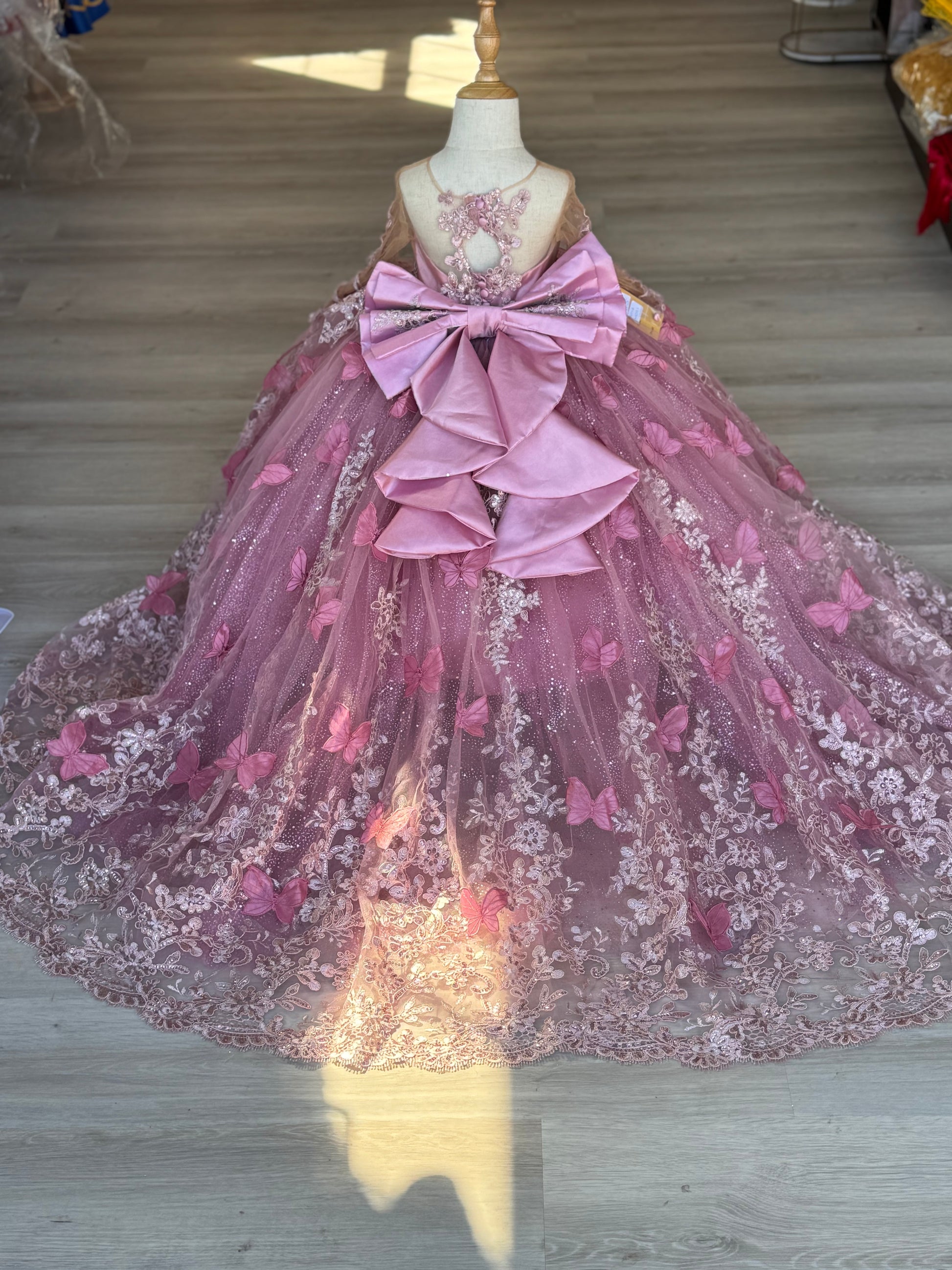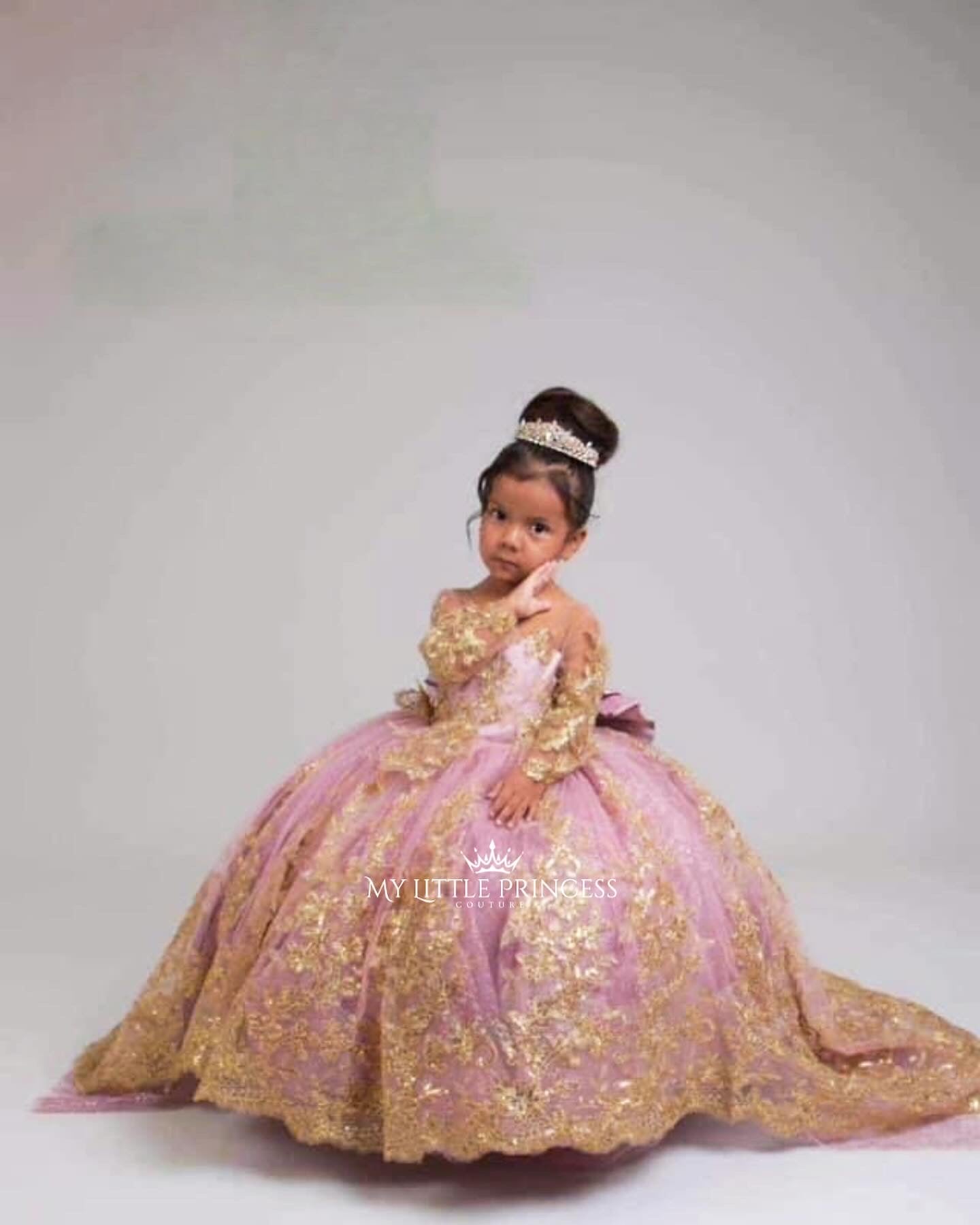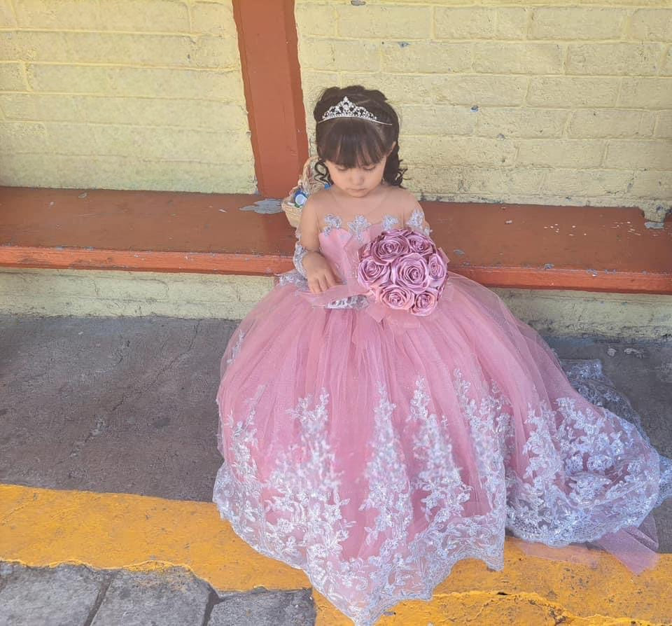 "This exquisite ball gown is designed to make any child feel like royalty. The full, flowing skirt is crafted with multiple layers to create a voluminous silhouette, while the fitted bodice is adorned with delicate lace appliqué.