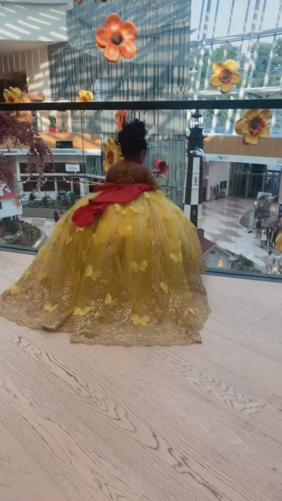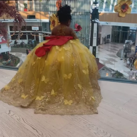 "This exquisite ball gown is designed to make any child feel like royalty. The full, flowing skirt is crafted with multiple layers to create a voluminous silhouette, while the fitted bodice is adorned with delicate lace appliqué.