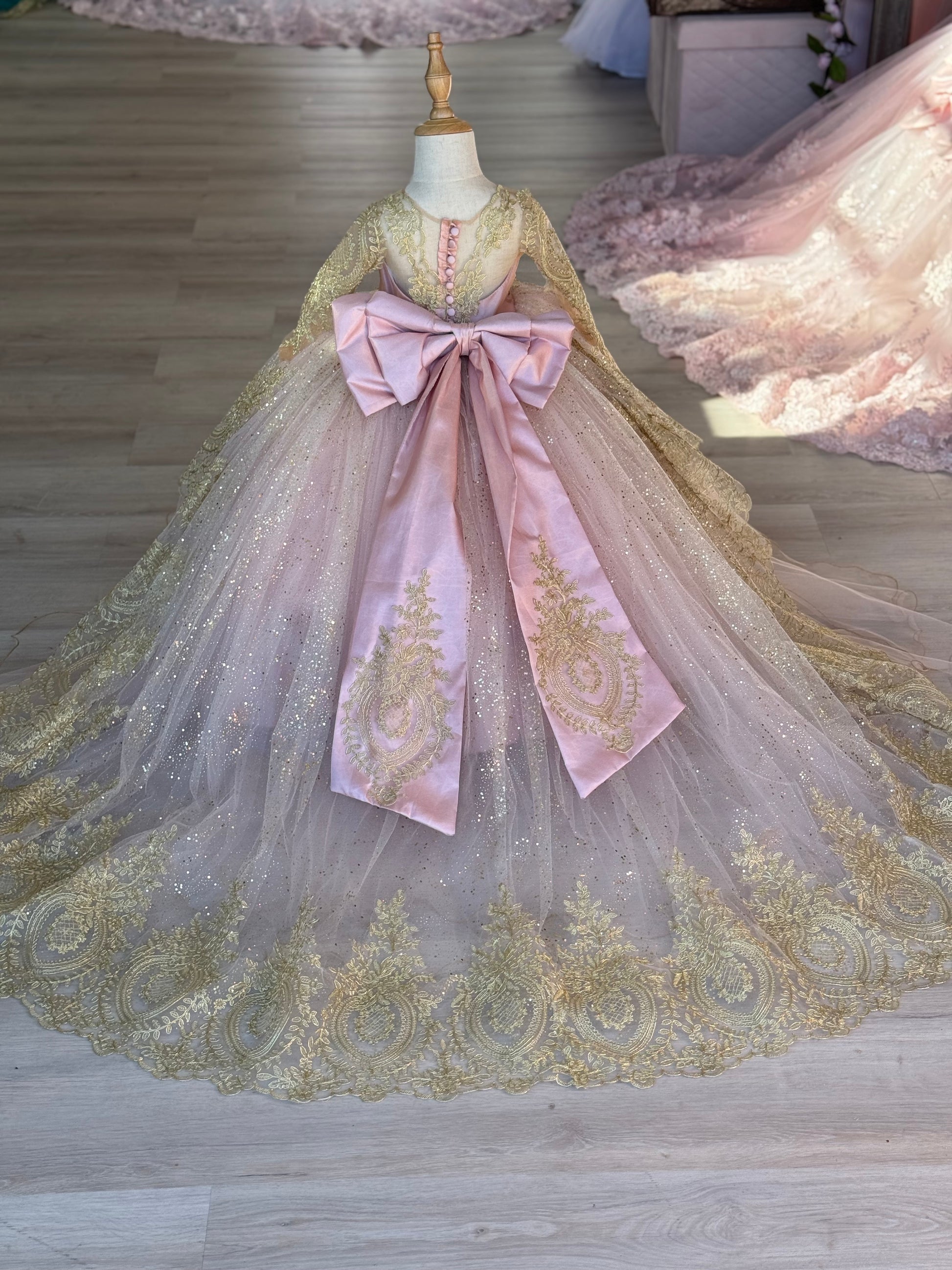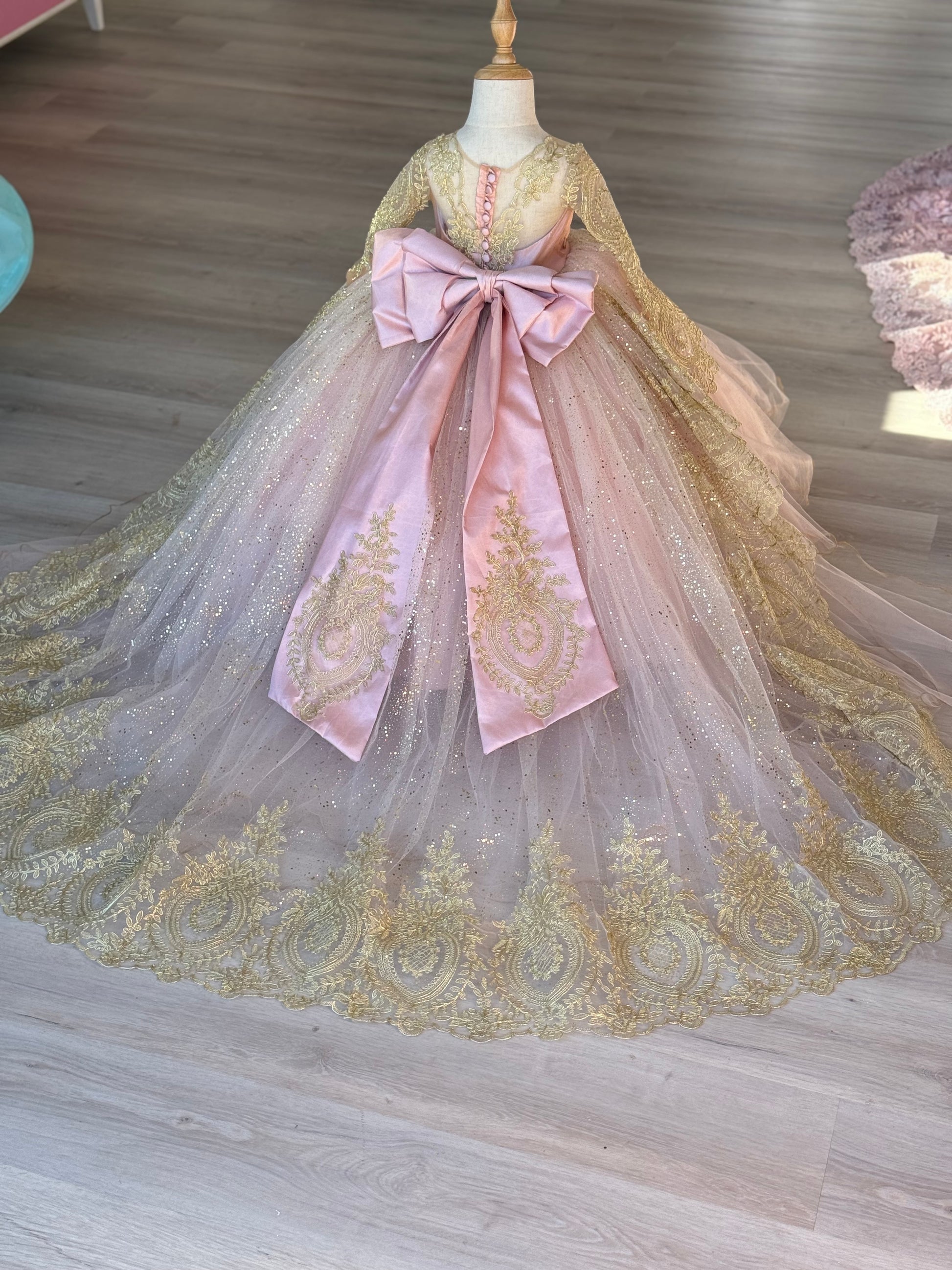 A magnificent gown designed to make every moment magical. The bodice features a classic sweetheart neckline and elegant long sleeves, beautifully adorned with intricate sparkling accents that radiate with every light. The skirt is a voluminous masterpiece with a shimmering finish that creates a truly enchanting silhouette. The back is completed with a magnificent, oversized bow and a classic button-up closure for a perfect and comfortable fit.