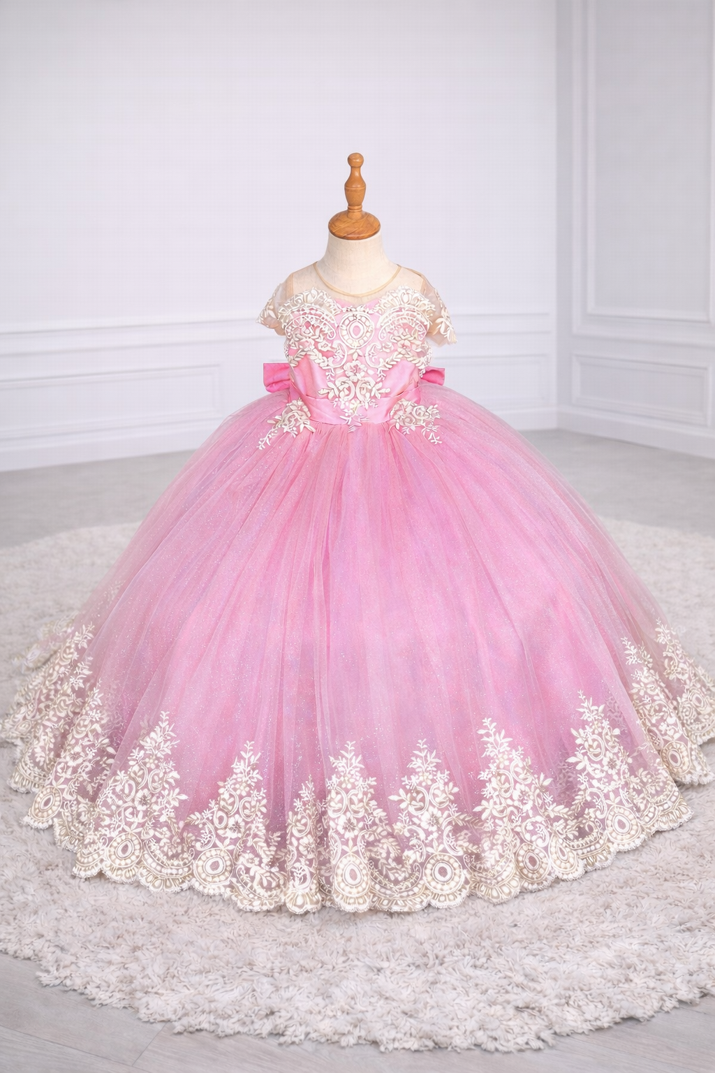 Elegant ball gown with a glitter tulle skirt, delicate lace appliqués, and a soft structured bodice. Perfect for princess themes, birthdays, and special celebrations.