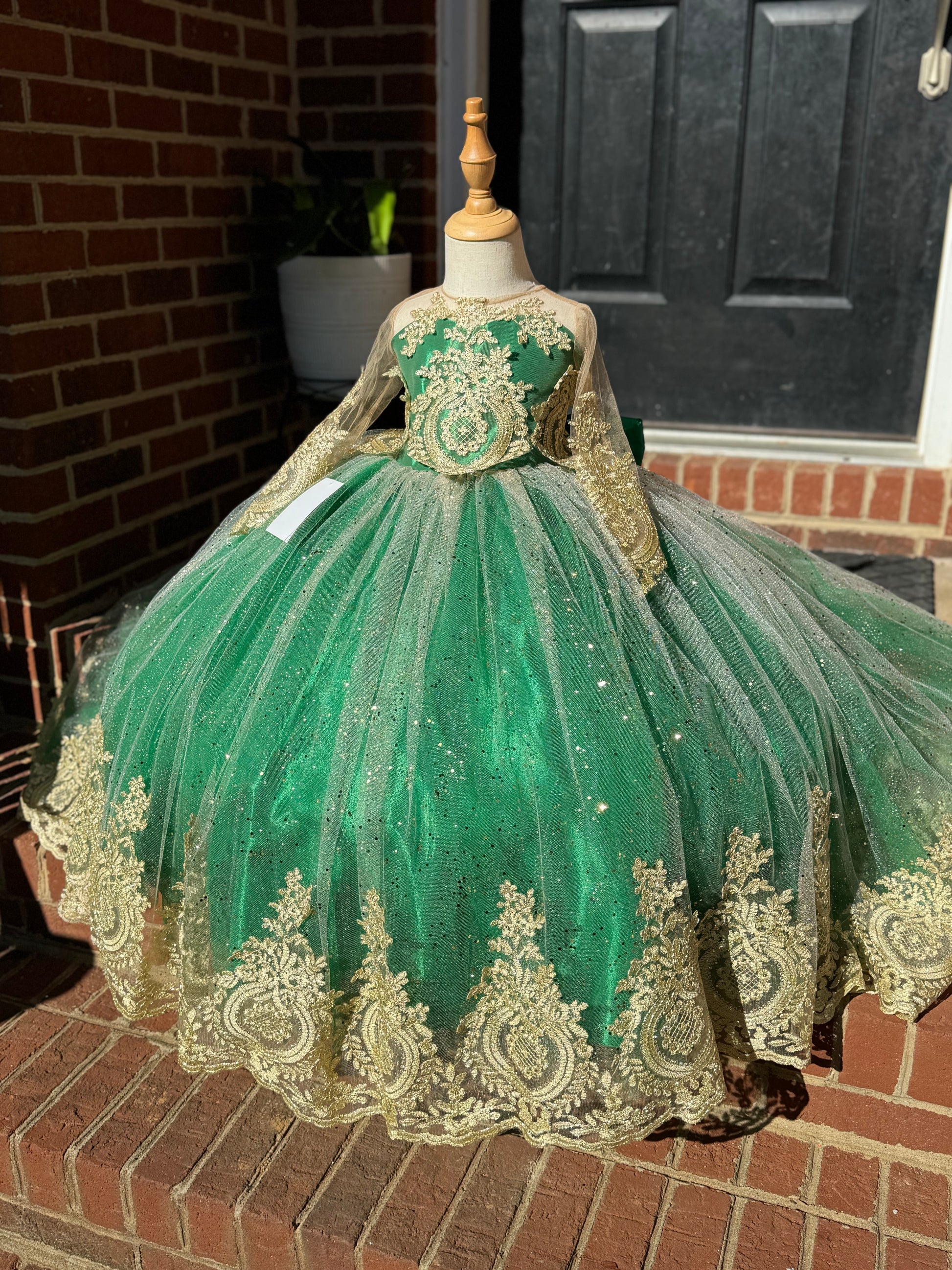 This beautiful gown is designed with a full, voluminous skirt featuring a long, cascading train. The skirt is adorned with intricate lace appliqués around the hem, creating a rich, ornate border. The bodice is typically form-fitting with long, sheer sleeves, and a prominent, elegant bow often graces the back.