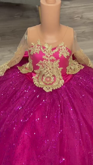 This beautiful gown is designed with a full, voluminous skirt featuring a long, cascading train. The skirt is adorned with intricate lace appliqués around the hem, which can be custom-made in white, silver, or gold, creating a rich, ornate border. The bodice is typically form-fitting with long, sheer sleeves, and a prominent, elegant bow often graces the back. The dress can be embellished with delicate butterflies throughout the skirt for an additional cost, and is also available as a versatile 2-in-1 style, offering a removable overskirt for an additional cost.