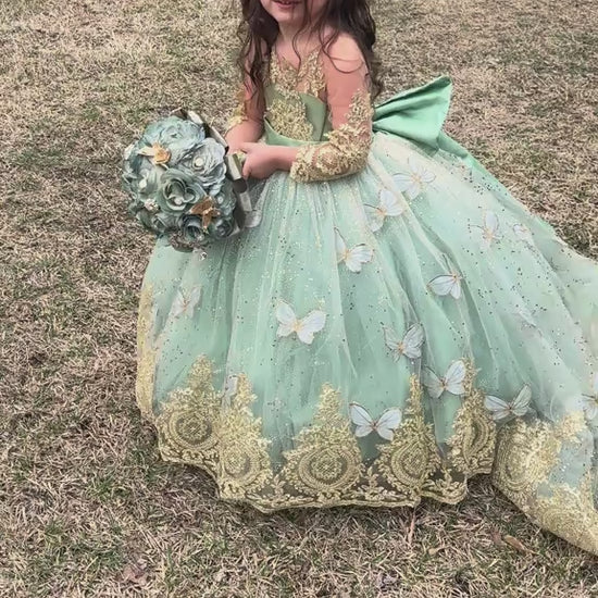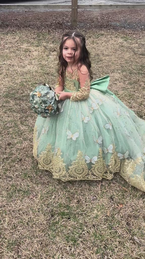 This beautiful gown is designed with a full, voluminous skirt featuring a long, cascading train. The skirt is adorned with intricate lace appliqués around the hem, which can be custom-made in white, silver, or gold, creating a rich, ornate border. The bodice is typically form-fitting with long, sheer sleeves, and a prominent, elegant bow often graces the back. The dress can be embellished with delicate butterflies throughout the skirt for an additional cost, and is also available as a versatile 2-in-1 style, offering a removable overskirt for an additional cost.