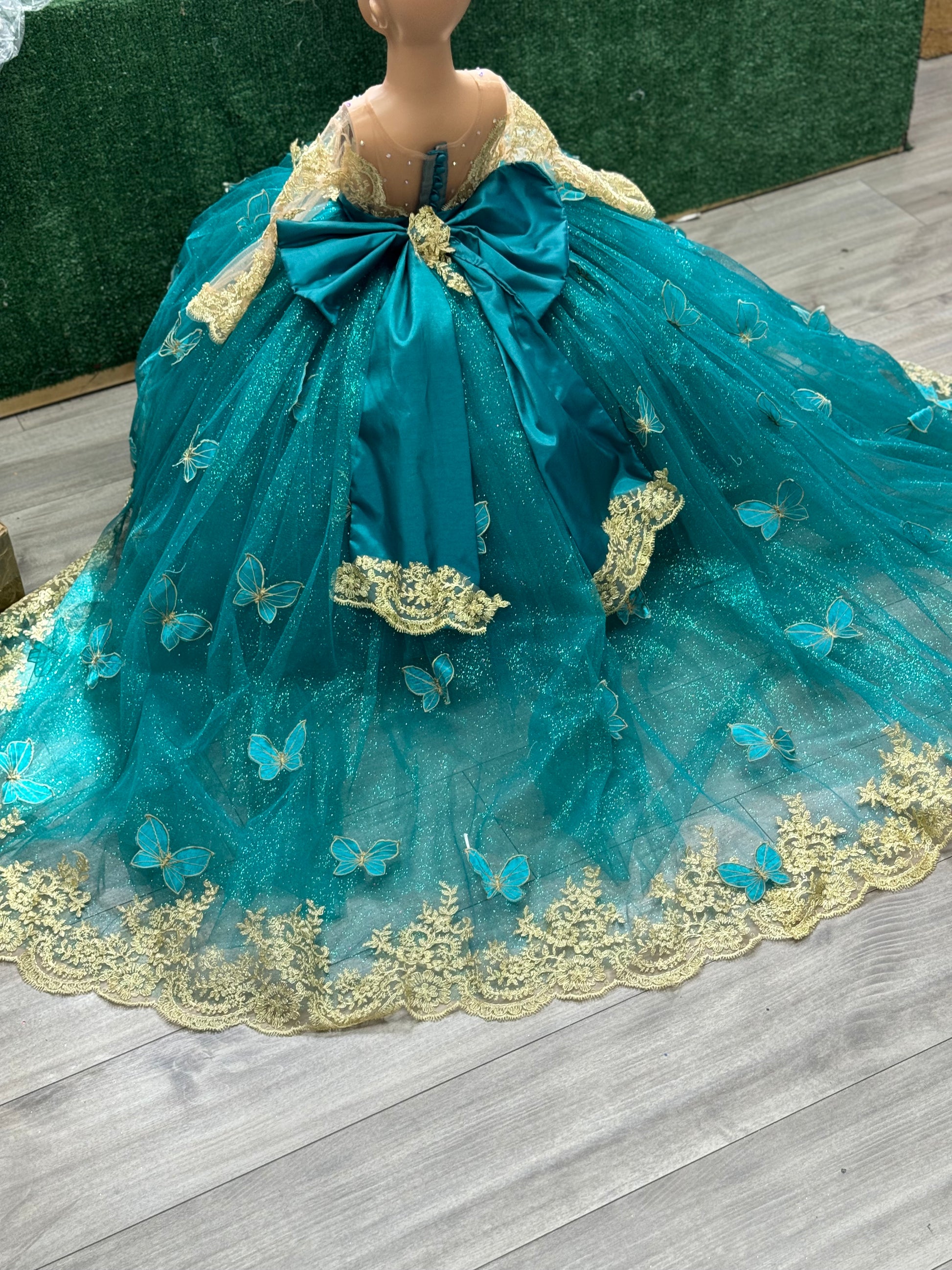 "This beautiful ball gown features a full, layered skirt with a dramatic train, perfect for a grand entrance. The entire skirt and train are bordered with an elegant lace appliqué. The bodice is also detailed with matching lace over a sheer fabric, complementing the long, delicate sleeves. The back of the gown features a sophisticated bridal button-up design, adding a touch of classic elegance. A large, satin bow at the back completes the enchanting princess look, making this dress ideal for quinceañeras, formal events, and special celebrations.