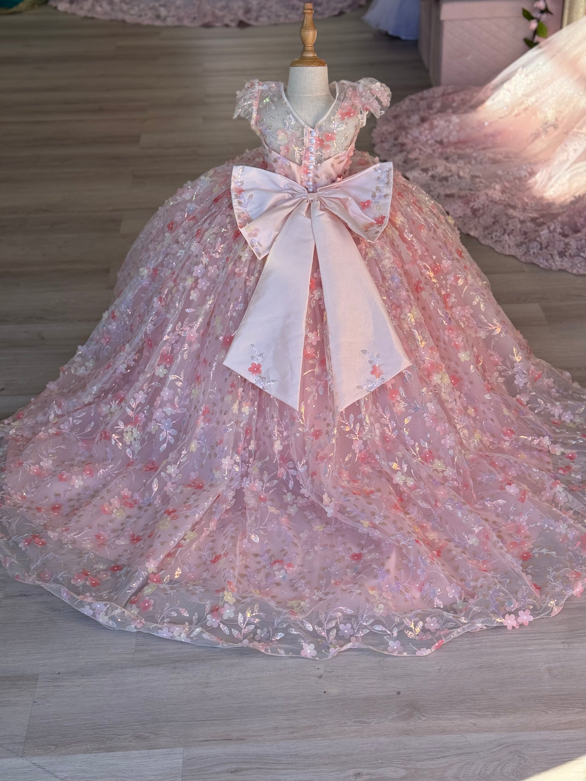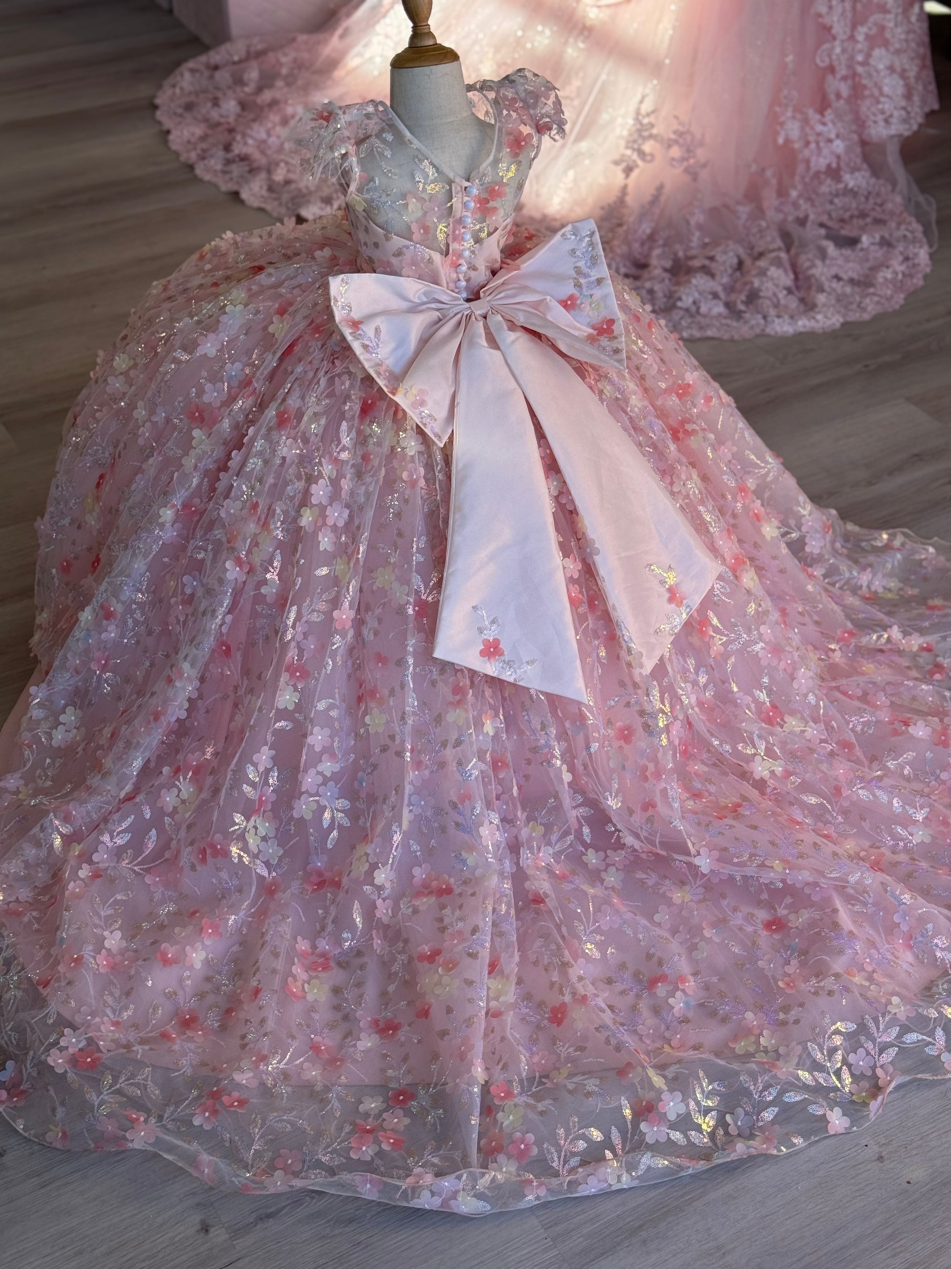 "This whimsical 2-in-1 gown offers an ethereal and enchanting look. The full, flowing skirt is layered with delicate floral, creating a beautiful dimensional effect. The bodice features intricate lace details and delicate sheer sleeves. A large satin bow adorns the back, adding a touch of classic charm.