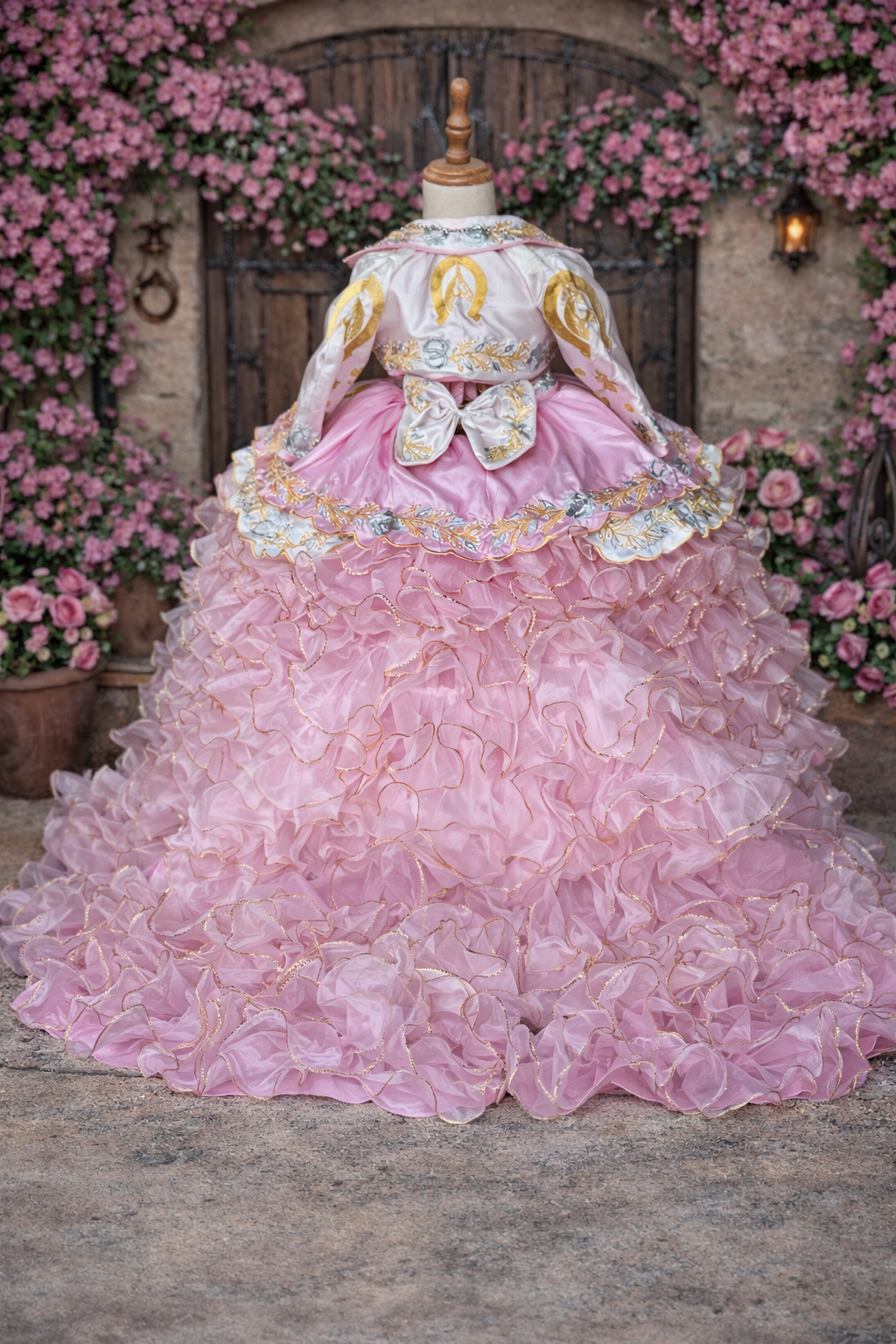 This elegant Charro-themed gown is a beautiful celebration of tradition and style. The 2-in-1 dress features a full, ruffled skirt layered with delicate fabric and adorned with intricate gold embroidery, including classic horse motifs. The fitted bodice showcases coordinating gold embroidery and a charming tie detail at the back.