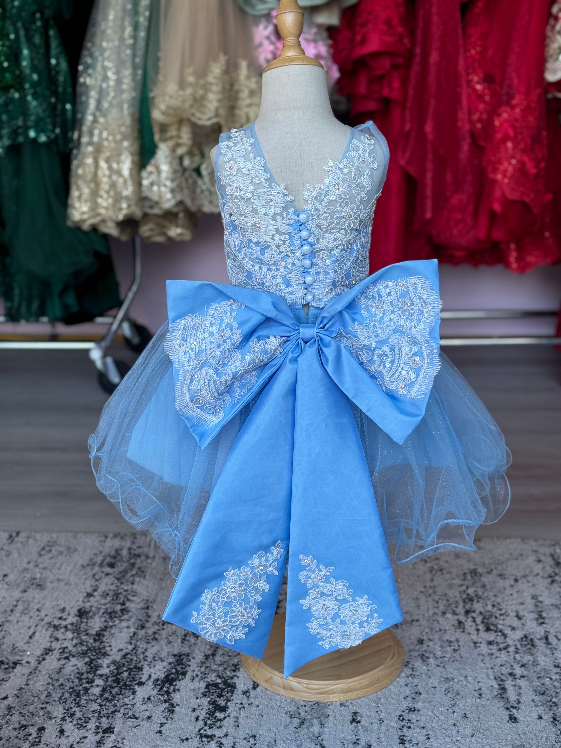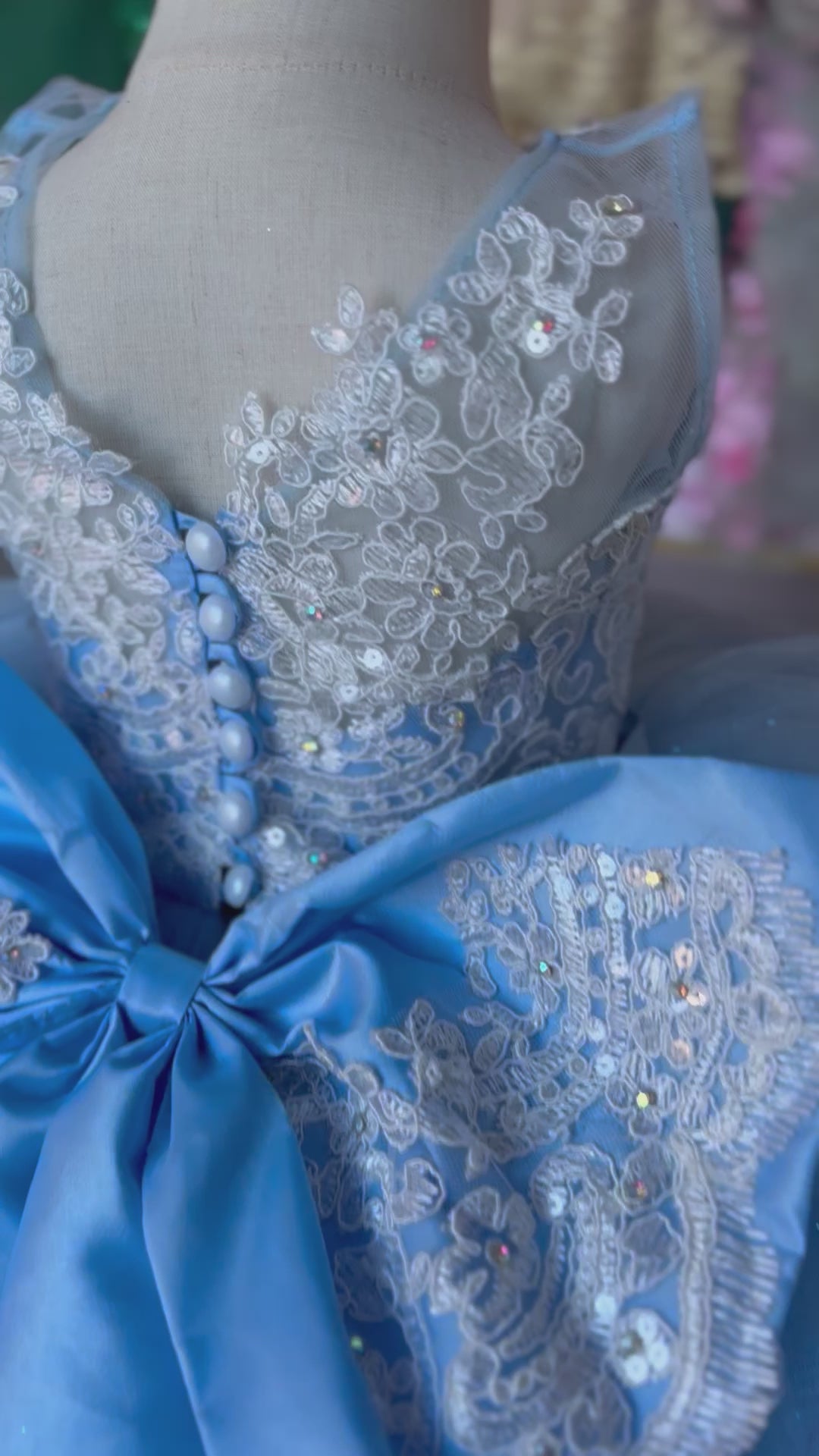 Elegant sky blue princess gown featuring delicate white lace detailing and a voluminous glitter tulle skirt. Designed as a 2-in-1 style, this dress includes a detachable overskirt for two beautiful looks in one — a grand ball gown silhouette for the main event and a lighter party look for dancing and celebrating. Finished with a statement satin bow for the perfect fairytale touch. ✨💙