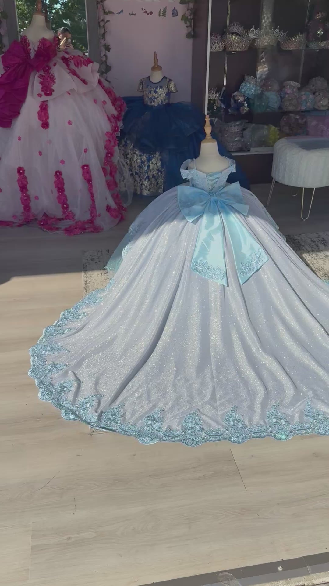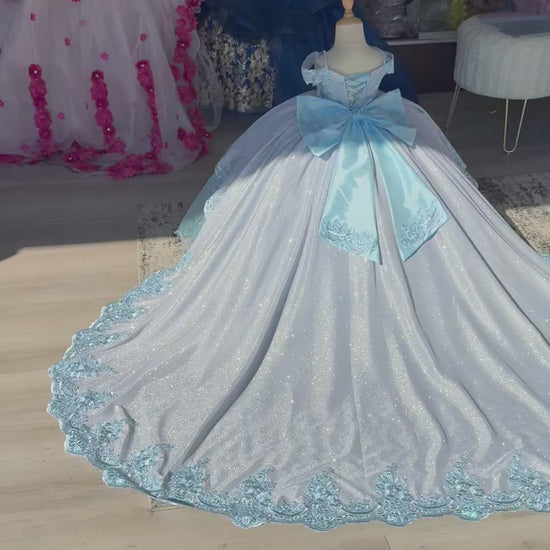The dress features a graceful V-neck bodice and delicate off-the-shoulder straps, adorned with intricate lace and sparkling embellishments. A thin band of shimmering jewels cinches the waist, leading to a skirt crafted from glitter-infused fabric. The hem is finished with an exquisite lace applique. Completing the final look is a grand bow at the back, from which a magnificent train cascades, made from a special iridescent fabric that shifts and shimmers with every movement.