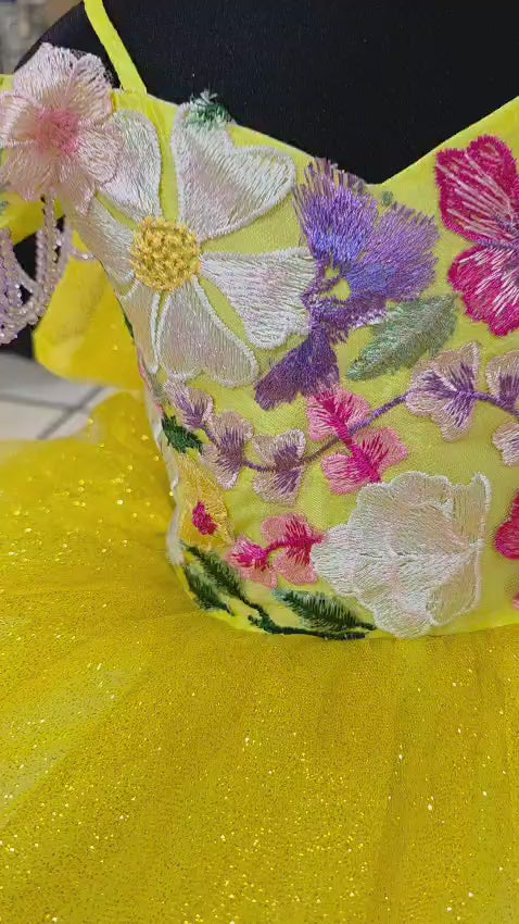 This enchanting 2-in-1 gown offers both a playful short style and a magnificent full-length look. The bodice features a classic sweetheart neckline and delicate spaghetti straps, with elegant off-the-shoulder sleeves. It is beautifully adorned with intricate floral embroidery in a rich, multi-toned palette. The voluminous skirt is crafted from a glitter-infused fabric that shimmers with every turn, creating a magical effect. A tiered overskirt is accented with a stunning band of matching floral embroidery, adding depth and dimension. The back of the dress is just as stunning, with a classic corset lace-up closure for a perfect fit. A large, dramatic bow is secured with a sparkling jeweled accent, completing this fairytale look.