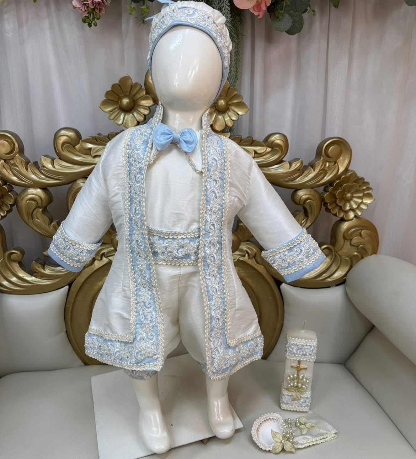 This exquisite baptism outfit features a white silk jacket with intricate light blue and lace trim, a matching vest with a bow tie, and comfortable shorts. The complete set includes a coordinating hat and a beautifully decorated candle, perfect for a traditional and memorable christening.