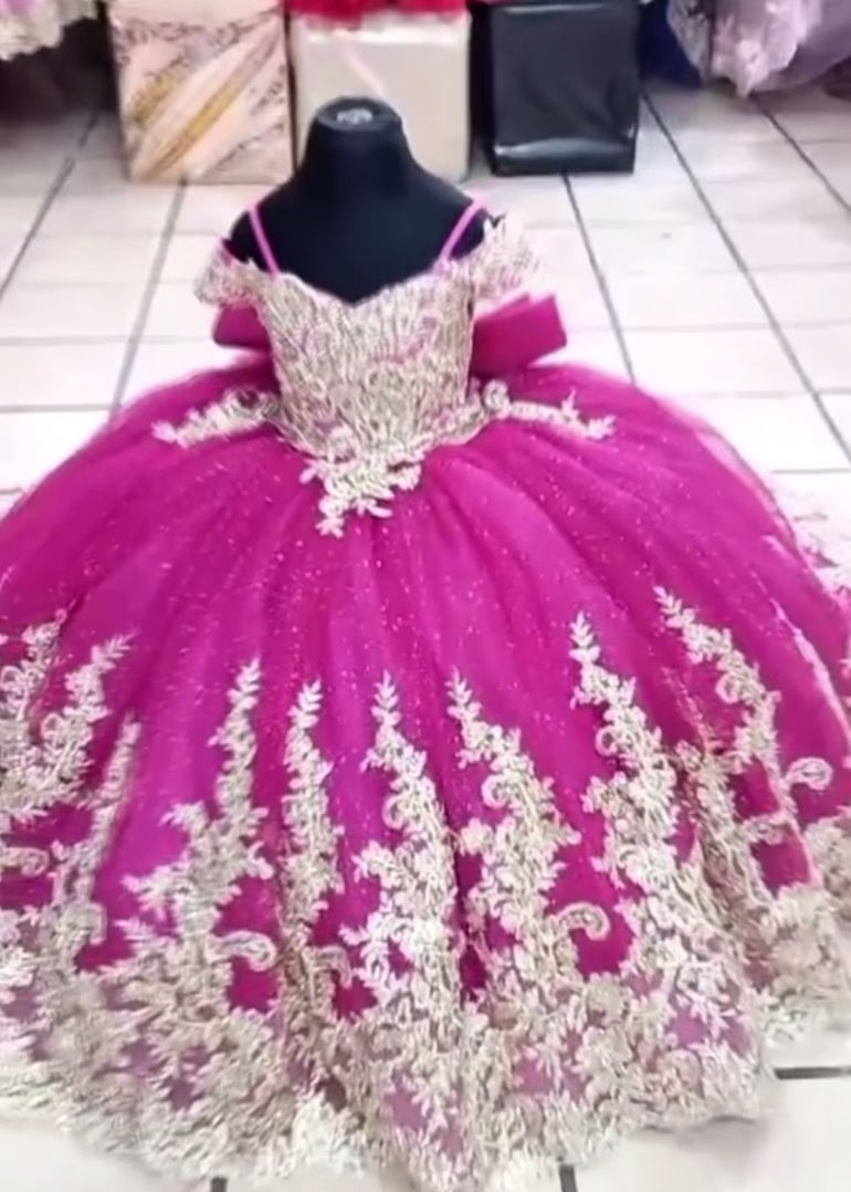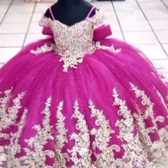 This enchanting 2-in-1 gown is designed for a truly magical celebration. The full, voluminous skirt shimmers with a beautiful glitter finish and is adorned with intricate floral lace appliqué. The elegant bodice features delicate, off-the-shoulder sleeves and a sophisticated corset-style lace-up back for a perfect fit. A large, luxurious satin bow completes the back, adding a touch of classic charm.