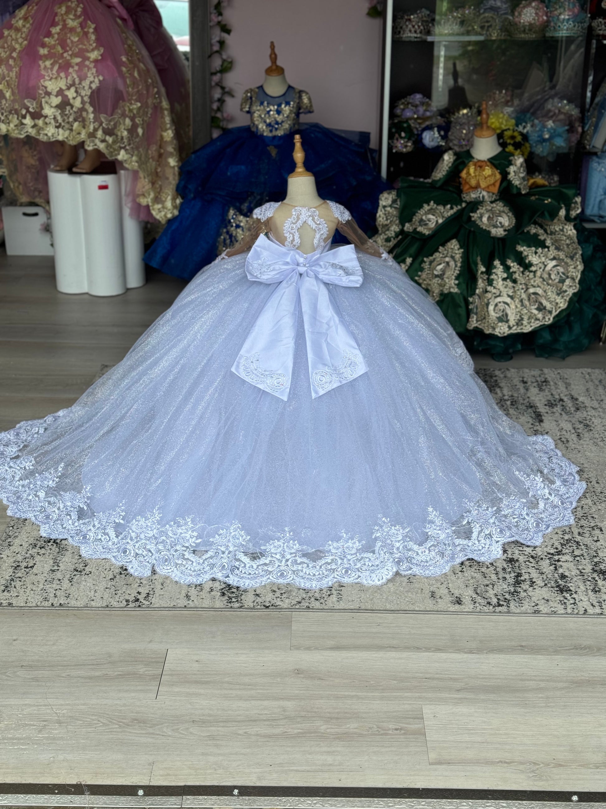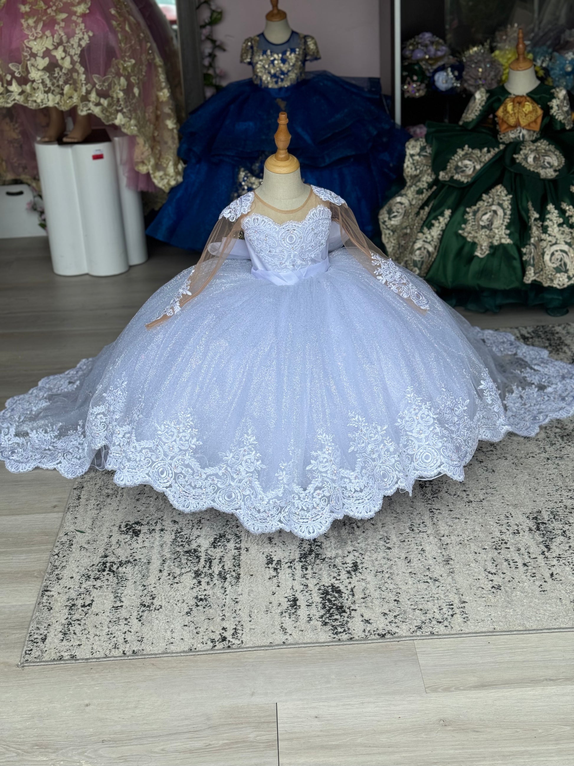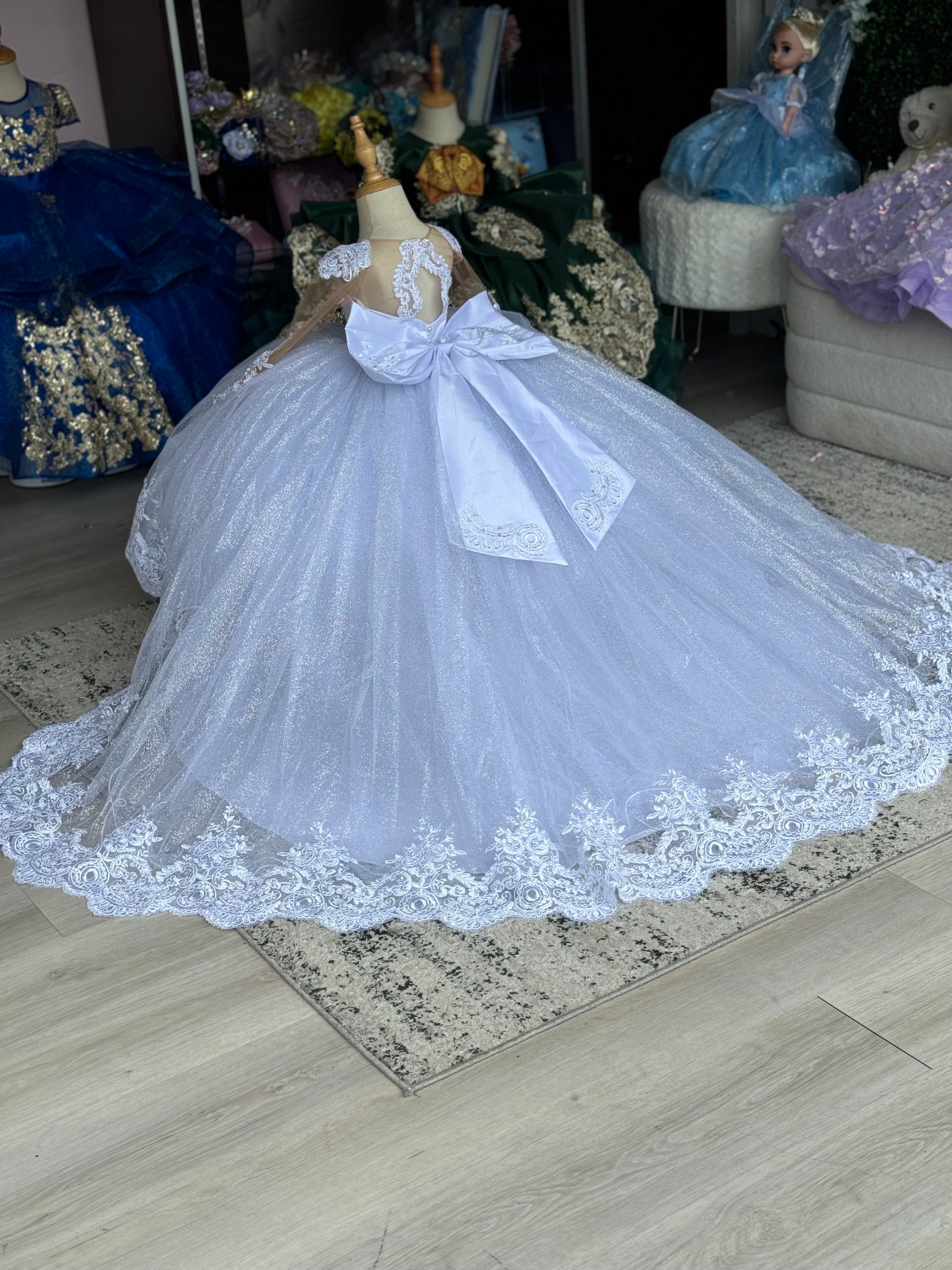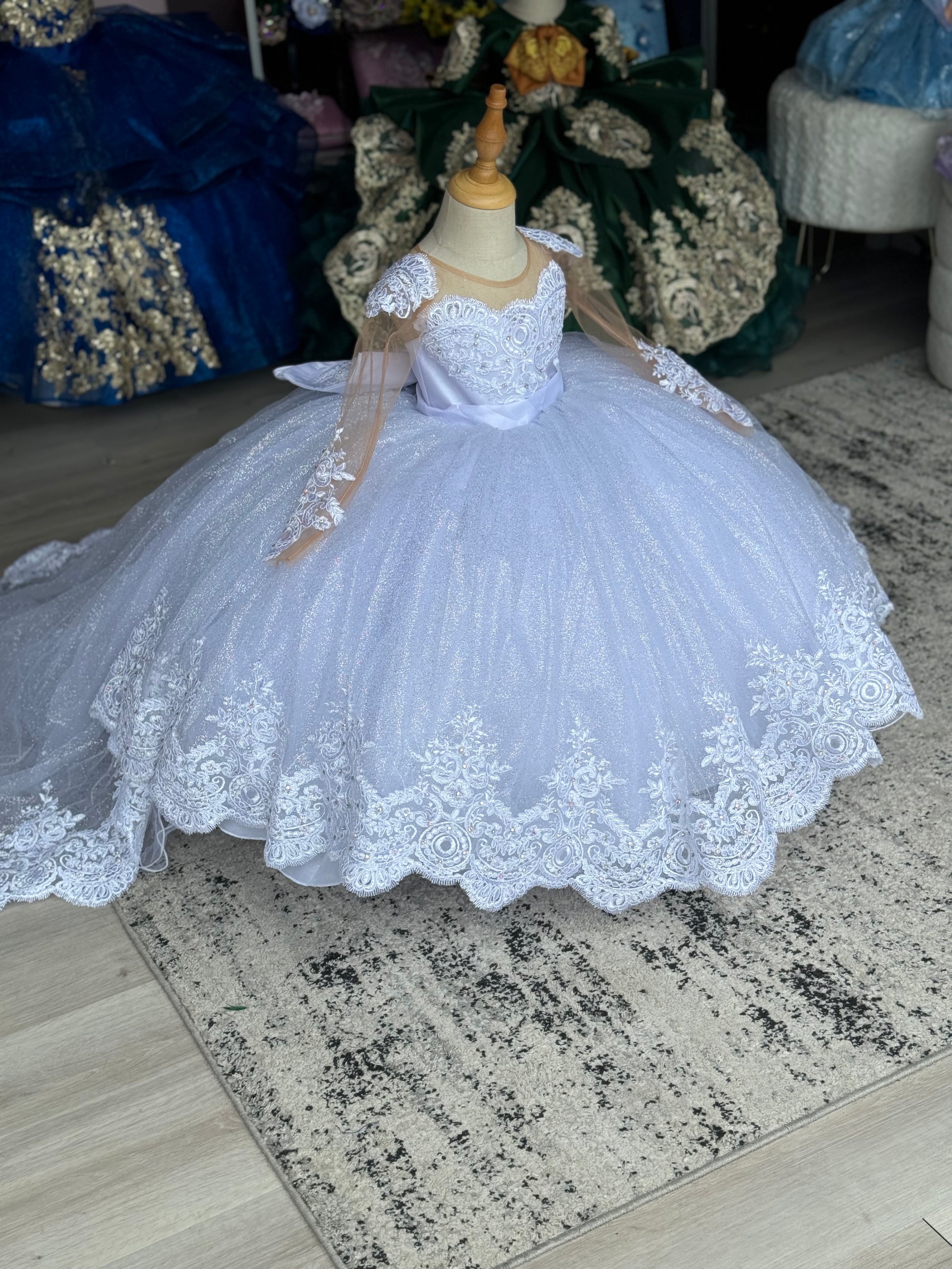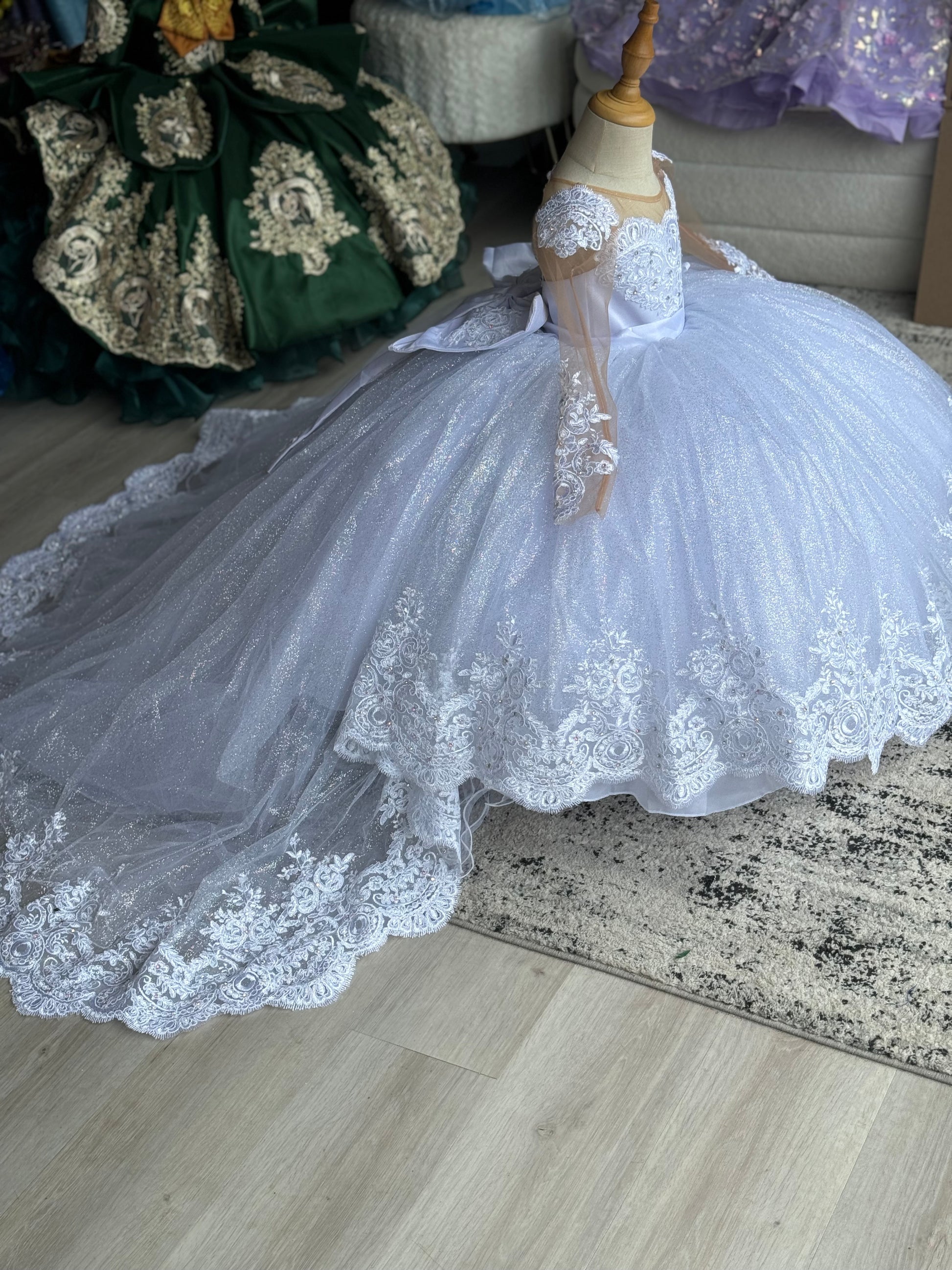 This stunning child's gown is a versatile 2-in-1 style, perfect for a special occasion. The dress features a lace bodice with an elegant scalloped neckline and long, sheer sleeves adorned with delicate lace appliqué. The full, floor-length skirt is made of a tulle, creating a dazzling and voluminous silhouette. The addition of glitter is optional. The back of the dress also features a dramatic train of the same tulle, with a wide border of intricate lace along the hem of the dress, giving the garment a cohesive and luxurious finish. This adaptable dress offers classic elegance with the option of whimsical sparkle.