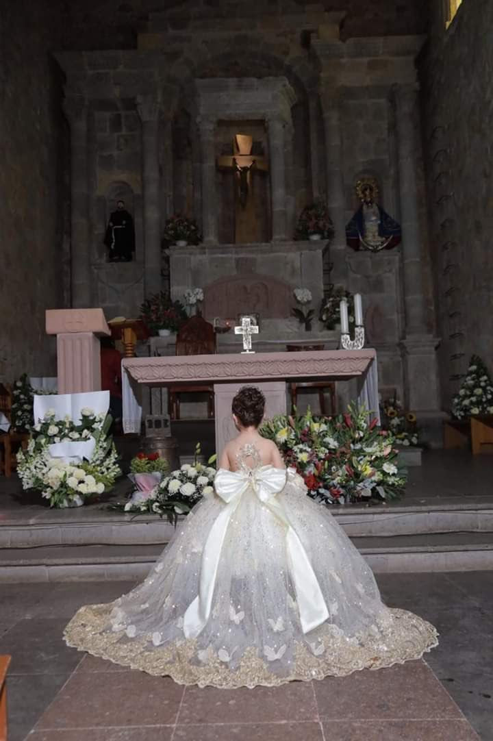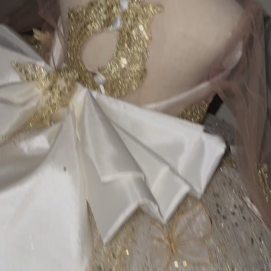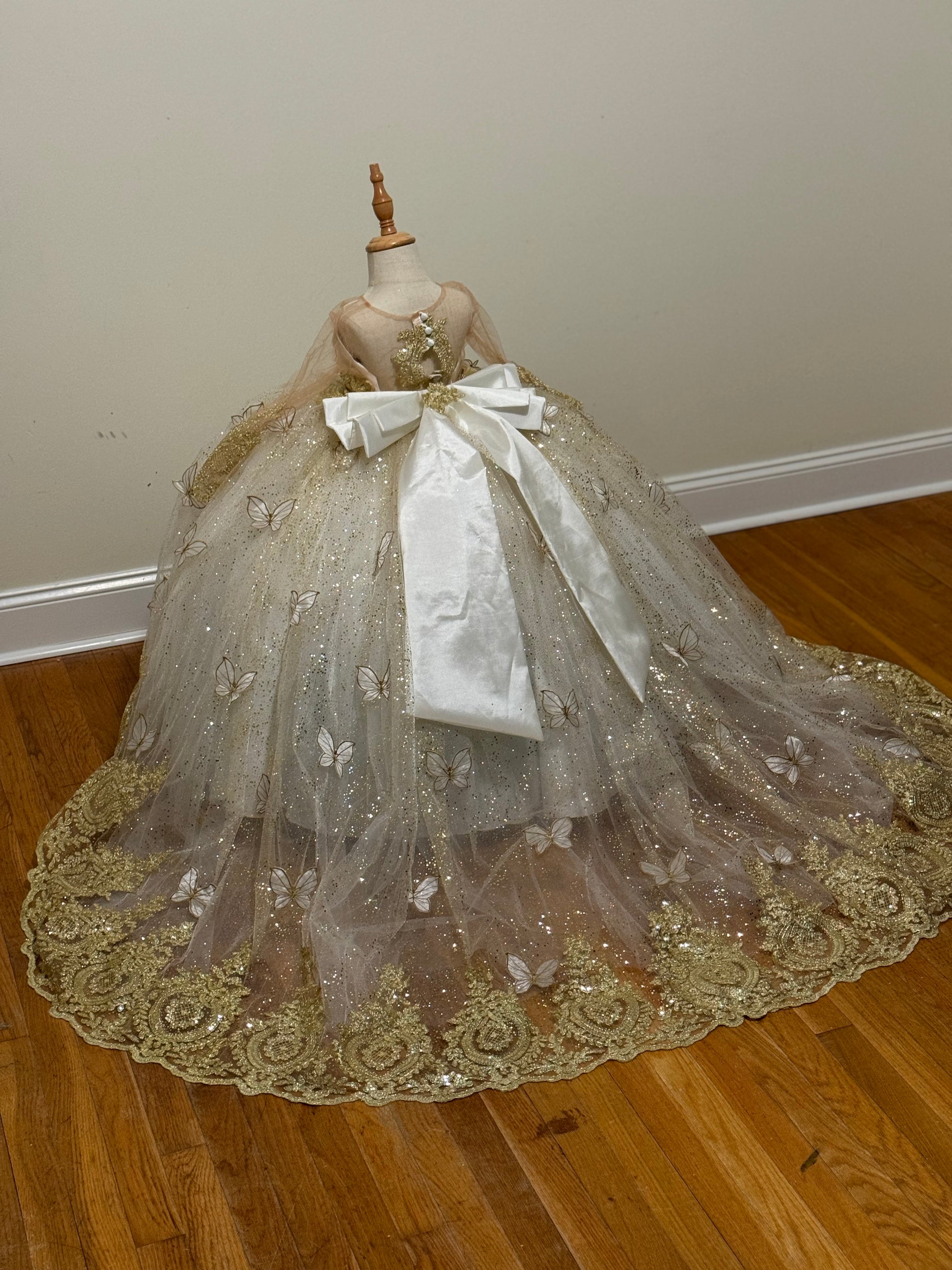This beautiful gown is designed with a full, voluminous skirt featuring a long, cascading train. The skirt is adorned with intricate lace appliqués around the hem, which can be custom-made in white, silver, or gold, creating a rich, ornate border. The bodice is typically form-fitting with long, sheer sleeves, and a prominent, elegant bow often graces the back. The dress can be embellished with delicate butterflies throughout the skirt for an additional cost, and is also available as a versatile 2-in-1 style, offering a removable overskirt for an additional cost.