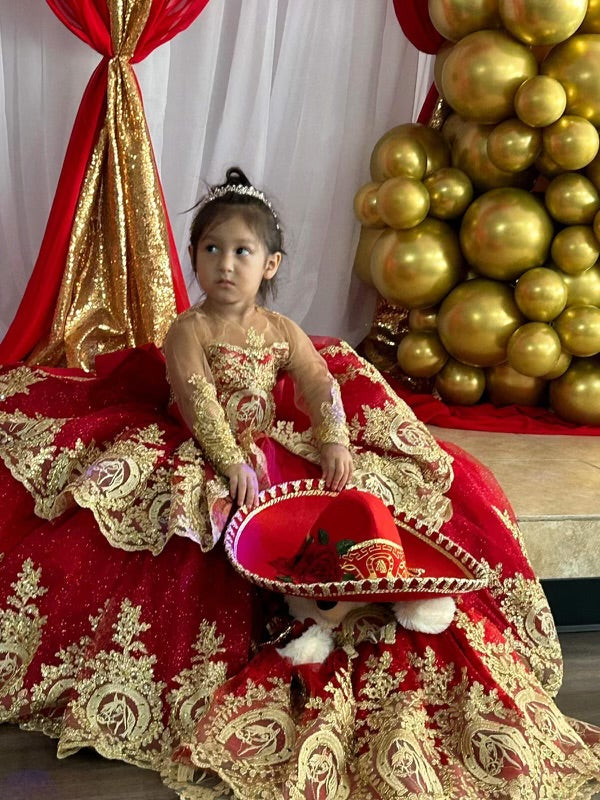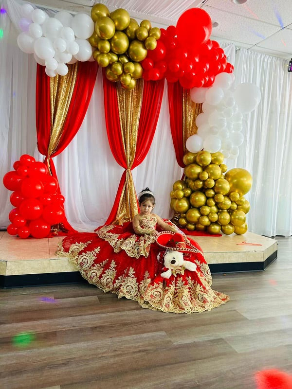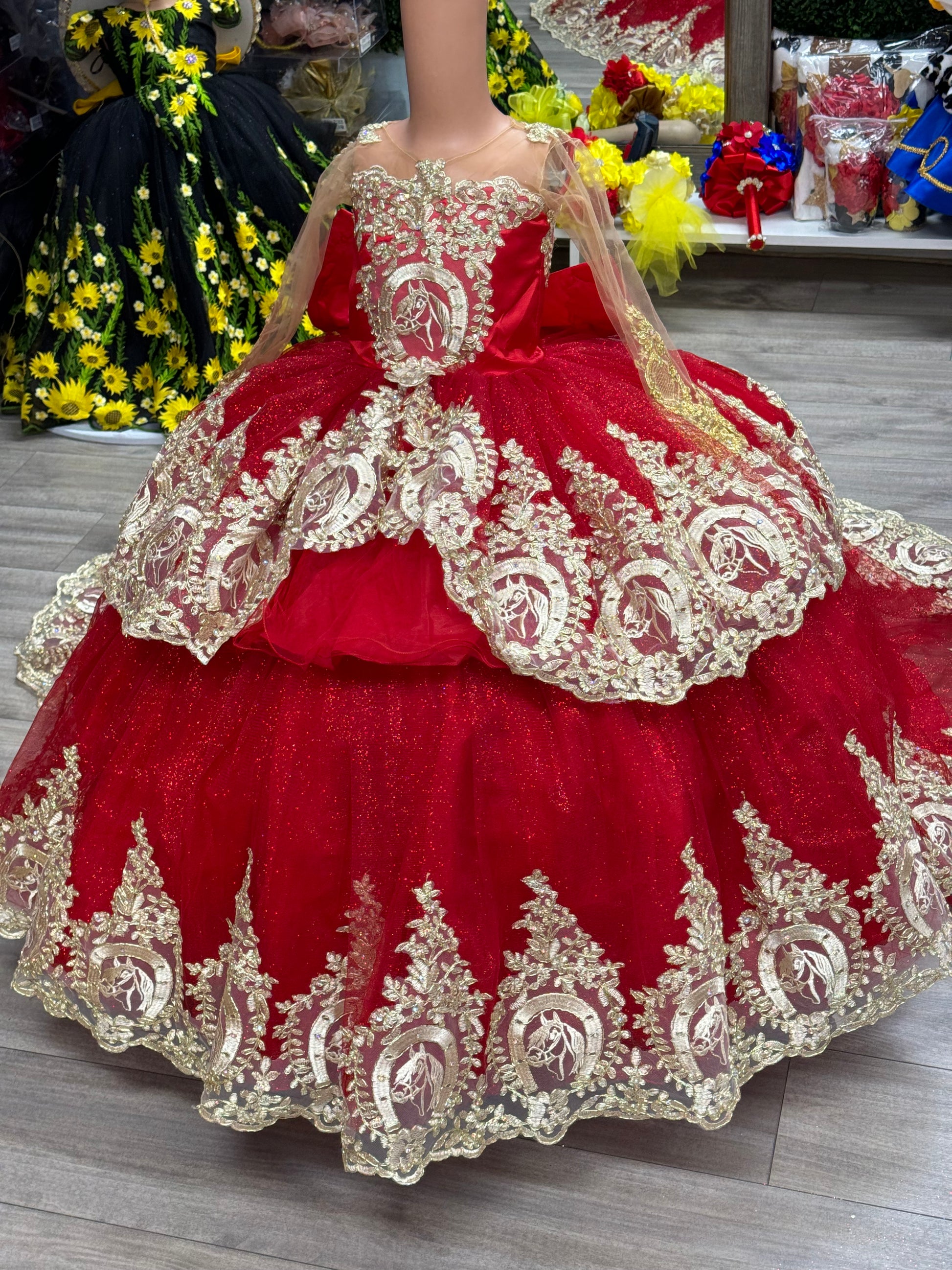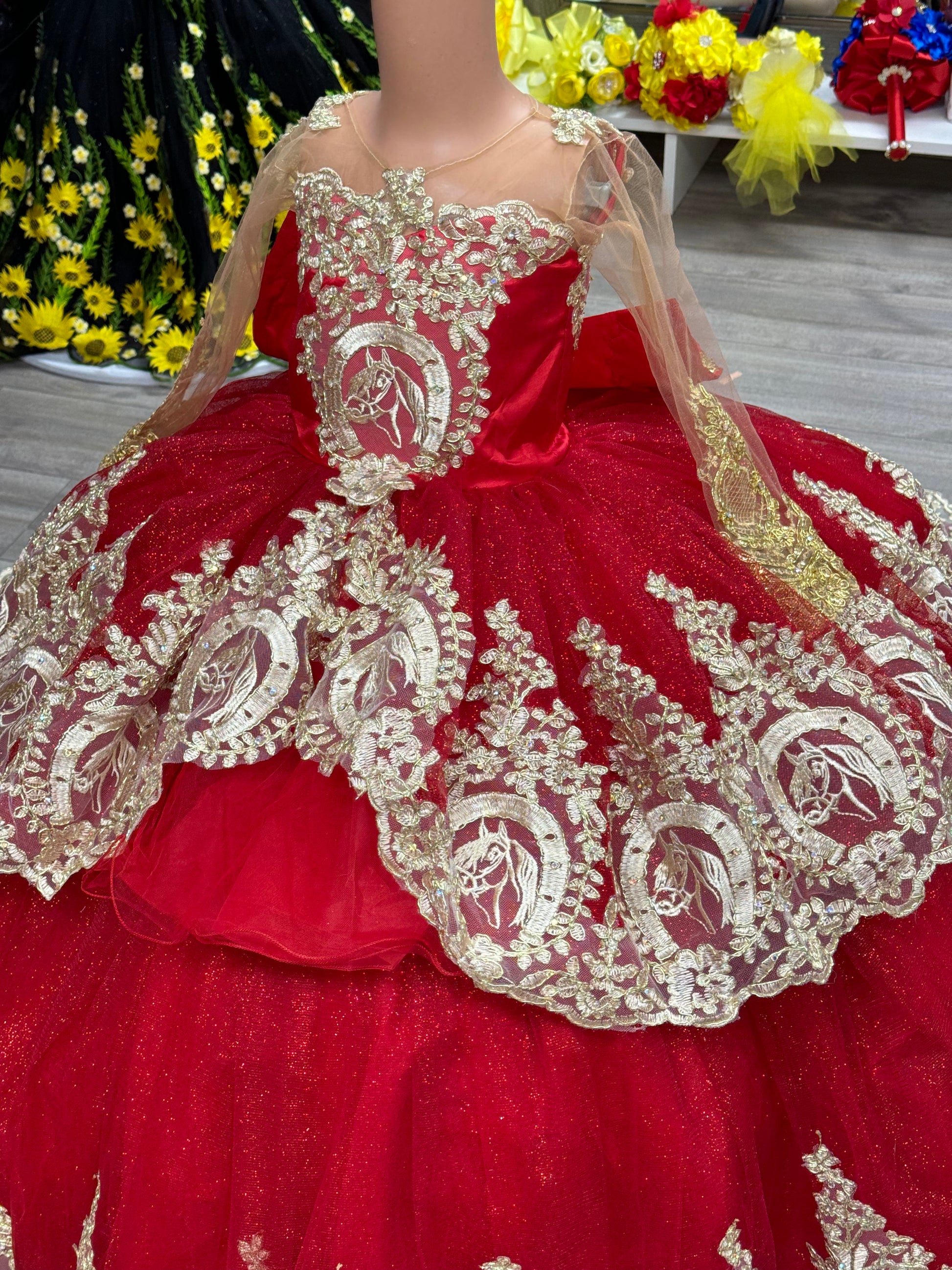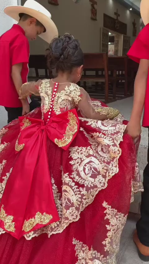 "This elegant Charro-themed 2-in-1 gown is a celebration of classic style and tradition. The full, tiered skirt shimmers with glitter and is adorned with beautiful, intricate horse-themed lace. The fitted bodice features matching lace over a sheer top, with an elegant bridal button-up design at the back. A large, luxurious satin bow completes the look, adding a touch of grandeur.