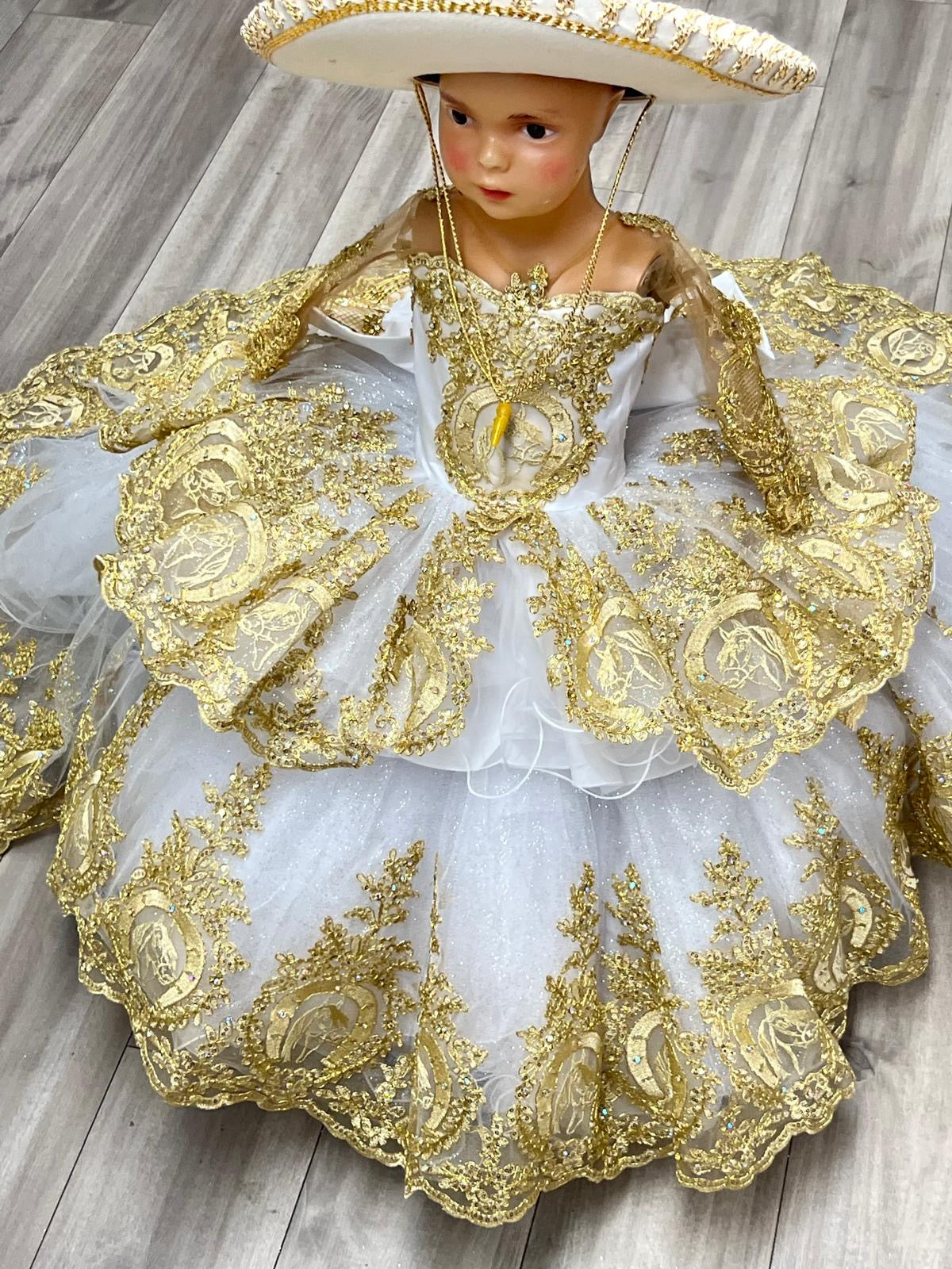 "This elegant Charro-themed 2-in-1 gown is a celebration of classic style and tradition. The full, tiered skirt shimmers with glitter and is adorned with beautiful, intricate horse-themed lace. The fitted bodice features matching lace over a sheer top, with an elegant bridal button-up design at the back. A large, luxurious satin bow completes the look, adding a touch of grandeur.