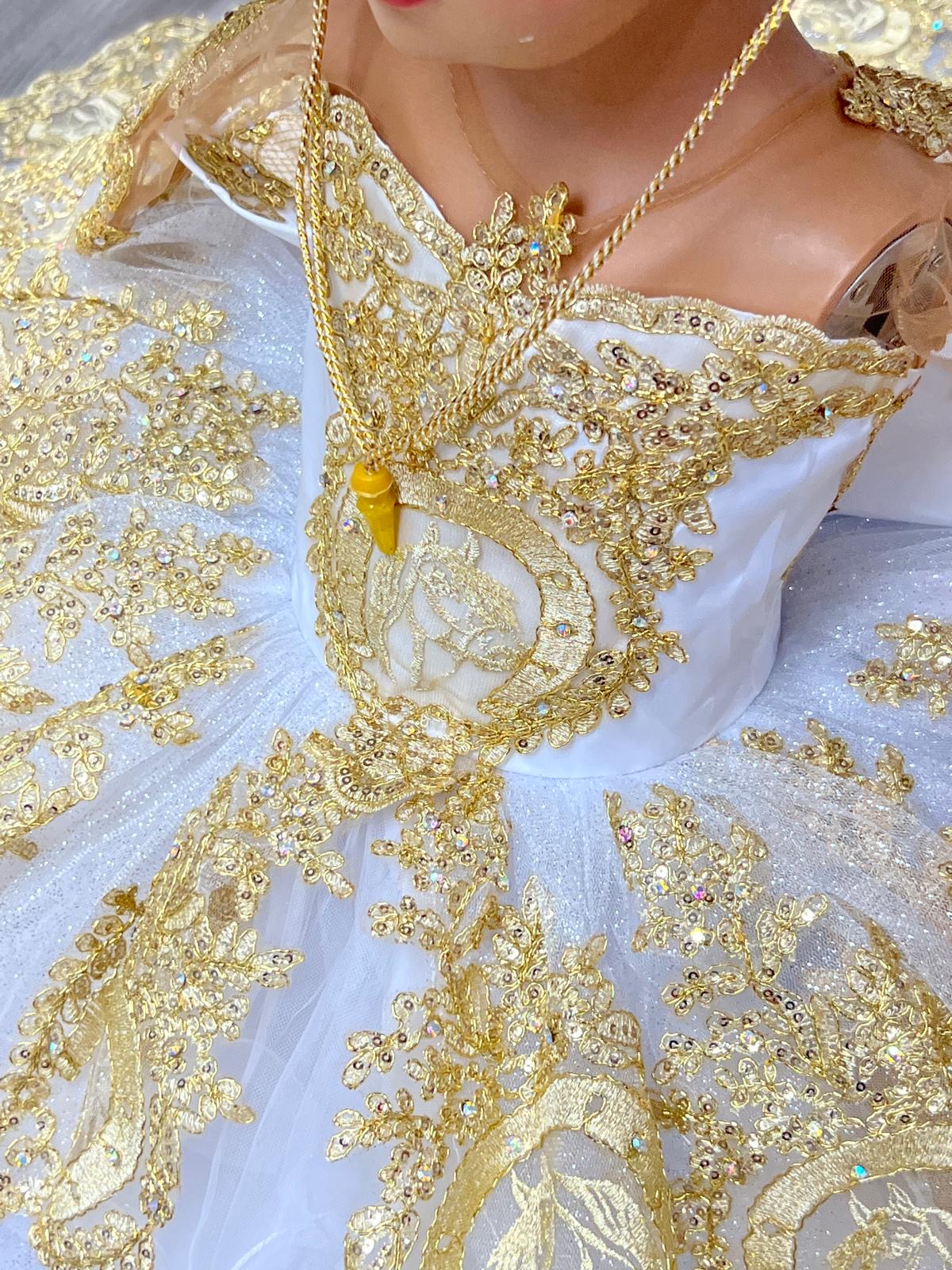 This versatile design allows the long, detachable skirt to be removed, revealing a playful, shorter dress underneath. This makes it perfect for a traditional event where a formal look and the freedom to dance and play are both desired.